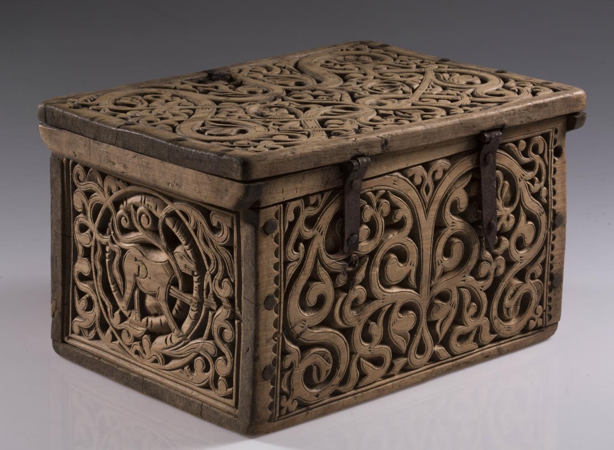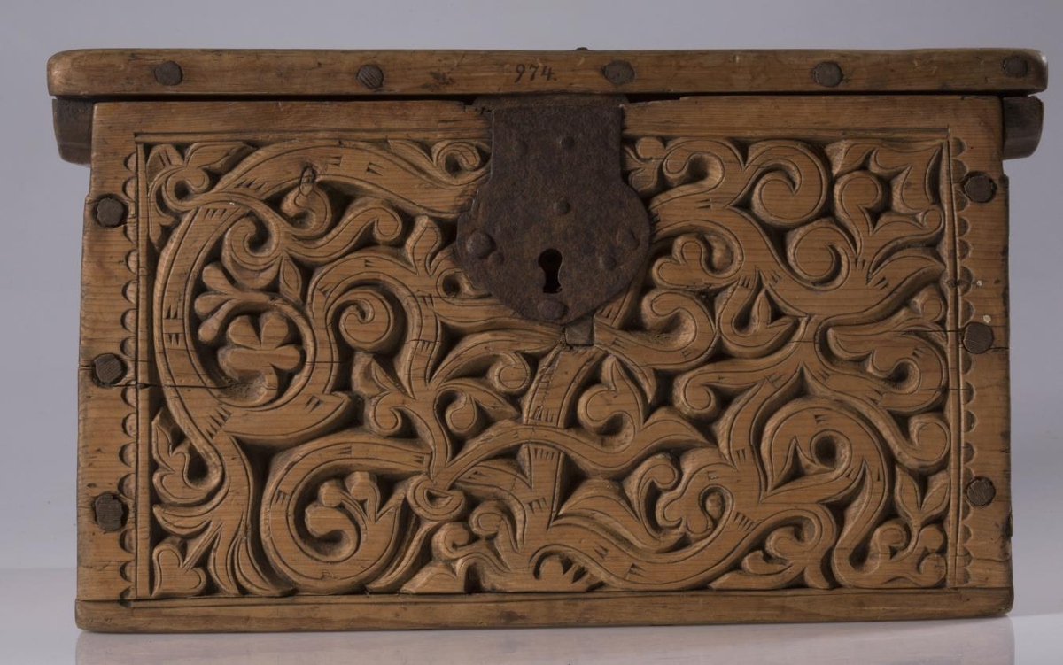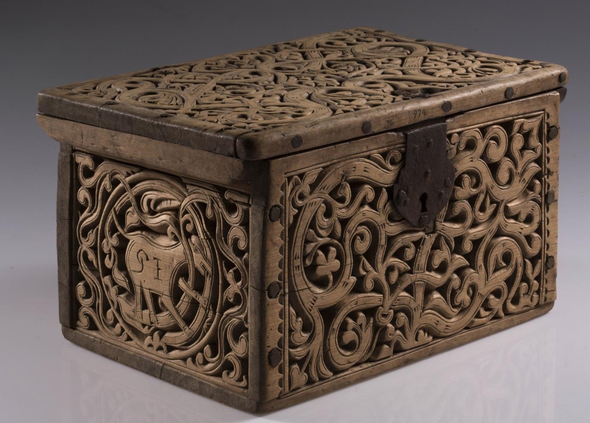 Kistill allur útskorinn með margbreyttum rósum nokkuð djúpum. Á báðum göflunum eru dýr að smjúga gegnum rósir. Á skrokkinn á þeim er skorið fangamarkið F.E.D.