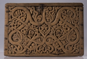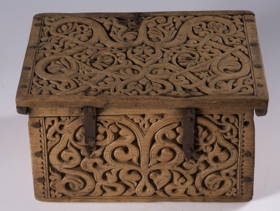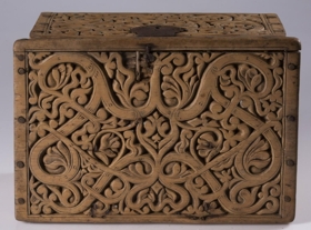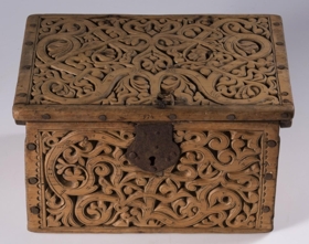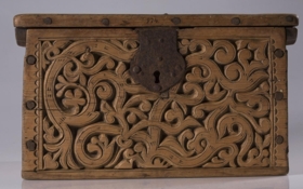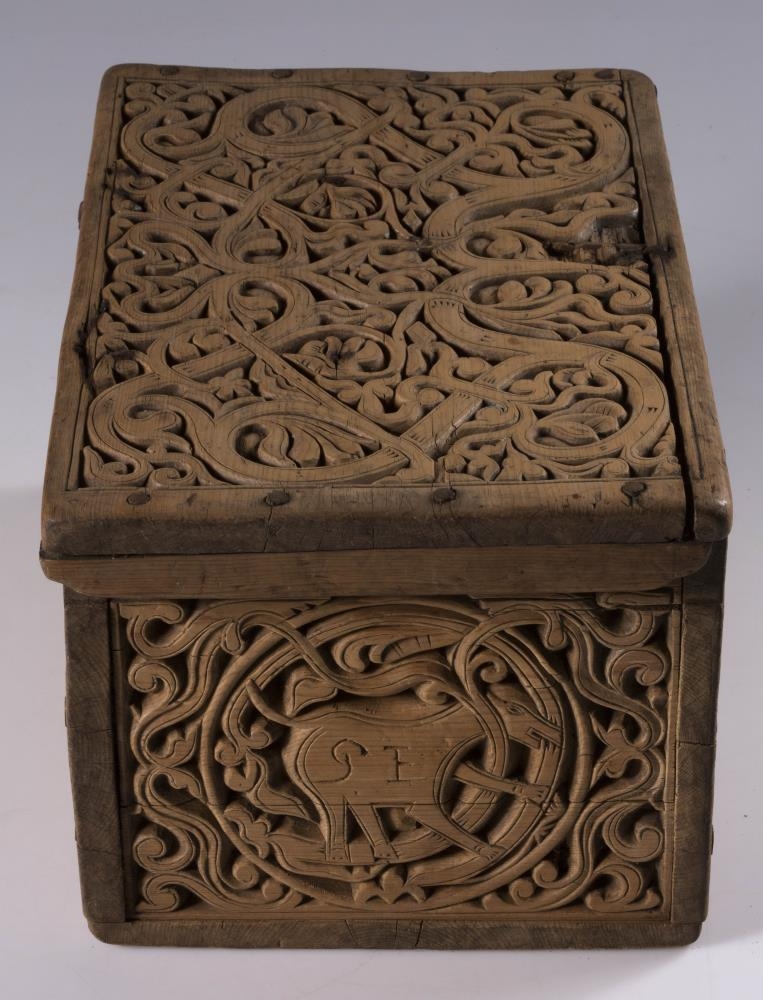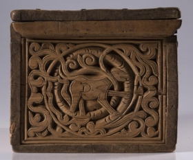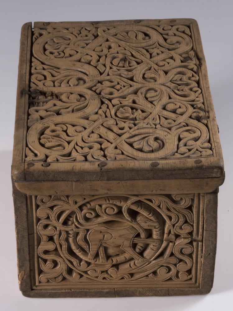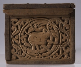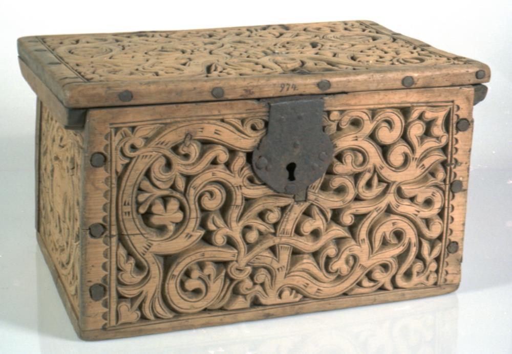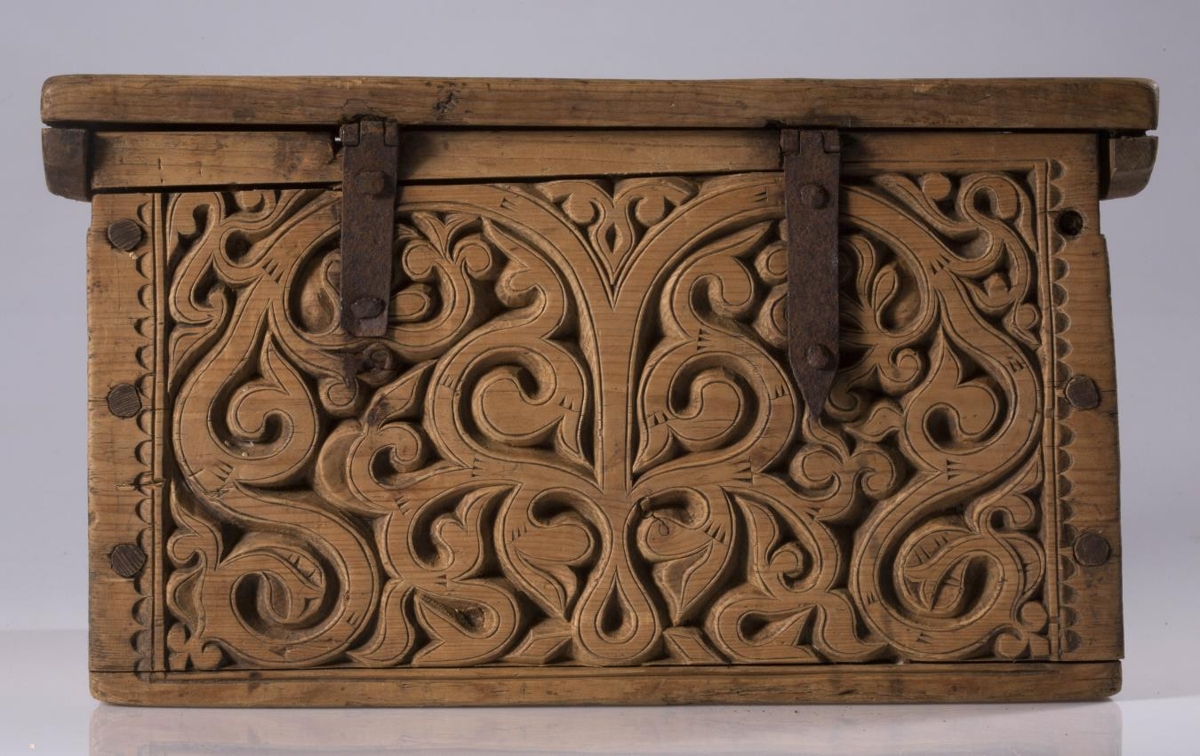 Kistill allur útskorinn með margbreyttum rósum nokkuð djúpum. Á báðum göflunum eru dýr að smjúga gegnum rósir. Á skrokkinn á þeim er skorið fangamarkið F.E.D.