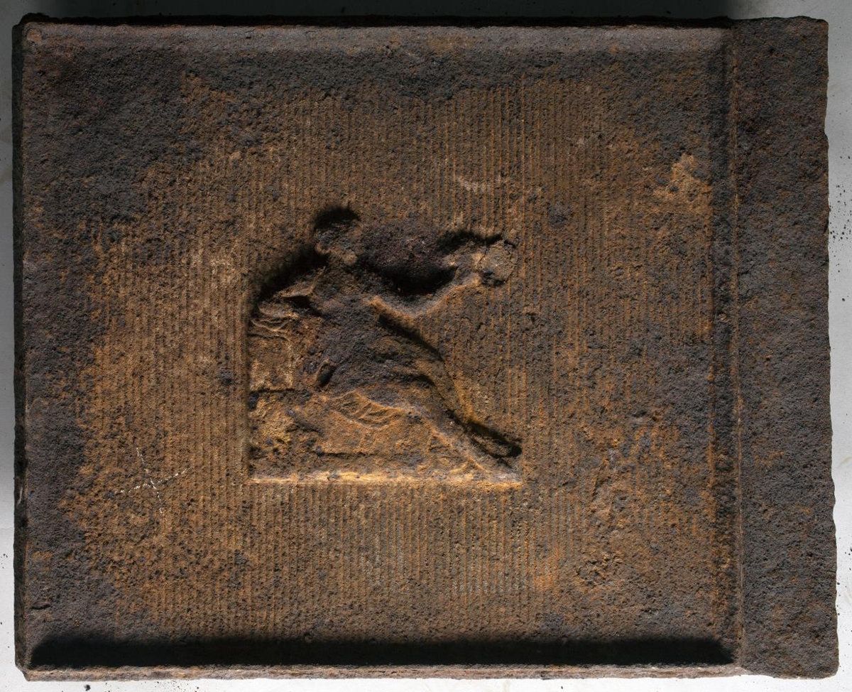 Ofnplötur 2 úr >> bíleggjara <<, br. 64, h. 51 sm.: á þeim miðjum er upphækkuð mynd af nakinni konu, er situr og heldur á blómkeri í vinstri hendi. Grunnurinn smá - rákóttur. Frá Nes - steypu í Noregi.