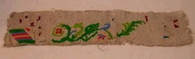 Bútur af stafaklút með grænu munstri. Það eru hlutar af munstri sem Þóranna saumaði í axlabönd á mann sinn Þórð Hjálmarsson. Stafaklútur er lítill dúkur oft úr hörlérefti, ullar- eða bómullareinskeftu með útsaumuðum smámyndum og stafrófi. Oftast var notaður krosssaumur. Upphaflega sýnishornaklútar sem konur saumuðu í munstur sér til minnis. Algengir í nágrannalöndunum en sjaldgæfir á Íslandi. Stafaklútar voru notaðir af handavinnukennurum fyrir nemendur í stað prufubóka. Sjá grein eftir Elsu E.Guðjónsson í Húsfreyjunni árið 1977, bls. 25-27.