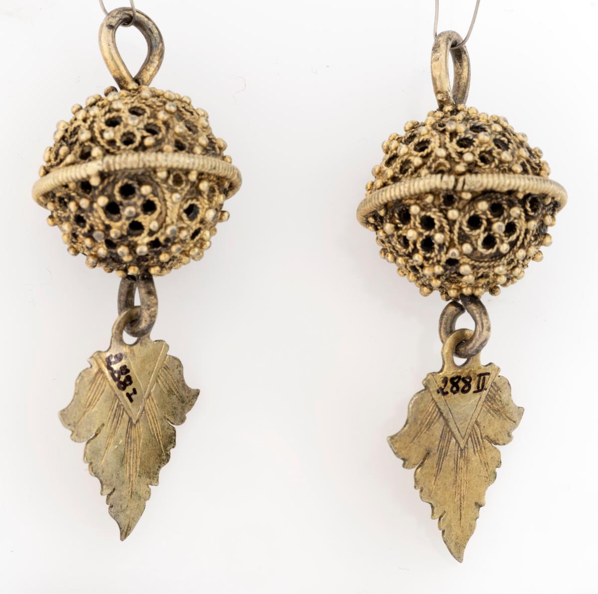 Lítill svuntuhnappur, vel gjör, með víravirki, gylltur og með gröfnu laufi.