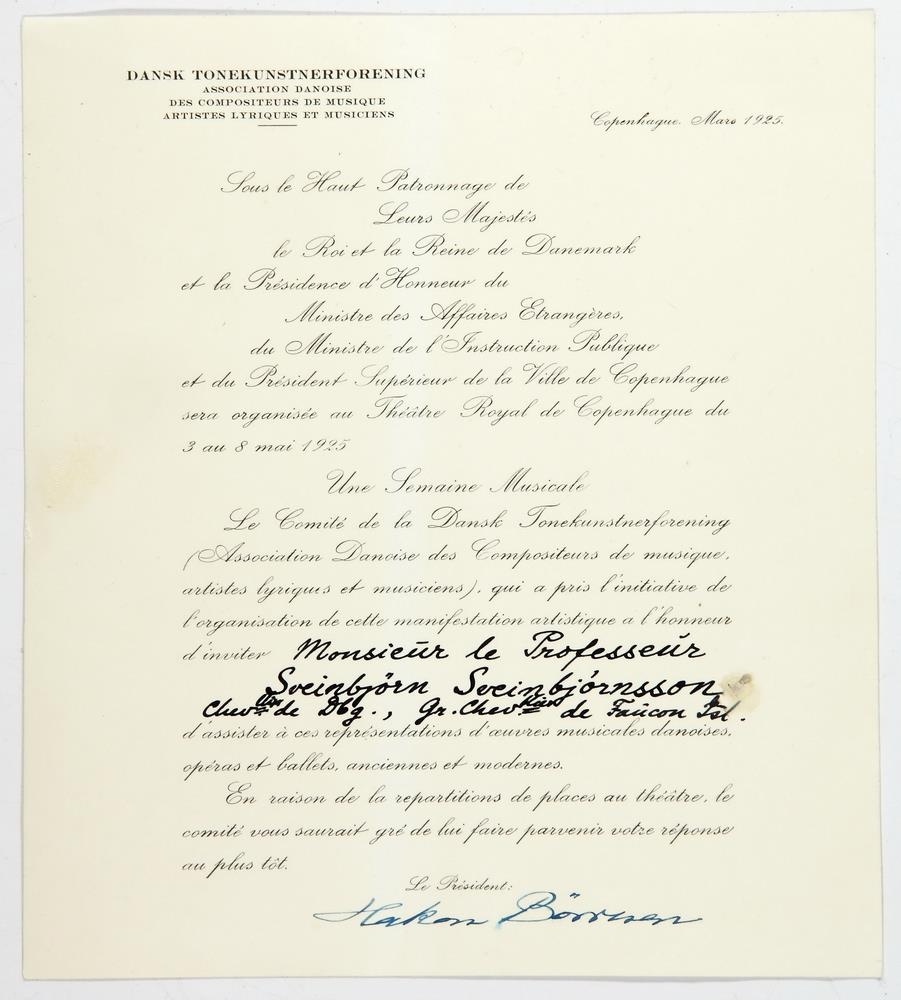 Prentað skjal með hausnum „Dansk tonekunstnerforening“. Dagsett í mars 1925. Í auða línu á miðju blaði er nafn Sveinbjörns skrifað með svörtu bleki. Undir skjalið er skrifað með bláu bleki. Hakon Börresen.