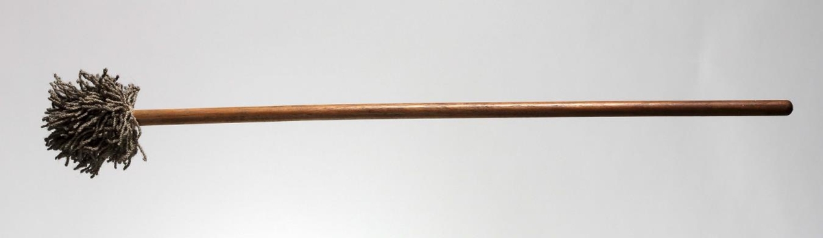 Flautaþyrill nýr: skaftið er 79 sm. að lengd upp frá hausnum og 2 sm. að þverm., sívalt. Hausinn er vafinn upp með kögri úr hvítum togþræði, og er það um 6,5 sm. að br. Gerður af Gunnari vefara Hinrikssyni.1) 1) Flautir voru búnar til þannig: Ný, spenvolg kúamjólk var hleypt með venjulegum hleypi og hlaupið látið standa í sólarhring við sem mestan kulda, en mátti þó ekki frjósa. Þá var hrært í hlaupinu vandlega niður til botns í ílátinu. Síðan var þeytt með þyrlinum unz ekki hækkaði lengur í ílátinu. Þannig var farið að þeyta: Ílátið, kolla eða biða, - taka 2 mjólkurfötur (kallast kerald eða skyrkerald syðra), - var látið standa á gólfi fyrir framan sig og hélt sá, er þeytti, flautaþyrlinum lóðréttum og snéri honum hratt milli lófa sér og stóð hálfboginn á meðan uppi yfir kollunni. - Þegar búið var að þeyta, var farið að þétta flautirnar og það var einnig gert með þyrlinum: settist þá sá, er það gerði, niður og hafði kolluna við hlið sér og snéri þyrlinum á kollubarminum og skyldi hafa þyrilshausinn á lagarbrúninni þannig, að altaf sæi á hann: var þyrlinum þá snúið mjög hægt. Lækkaði þá lítið eitt í kollunni, en þetta skyldi gera unz allar bólur voru úr flautunum og þær orðnar þéttar. Skyldi þá skamta þær og borða strax. Stæðu flautirnar að mun, settist mysan undir og var þá sagt að grotnuðu flautirnar (grotnaðar flautir).