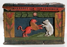 og 15½ á breidd, hann er allr útskorinn með rósum, mannamyndum og dýra, hann er