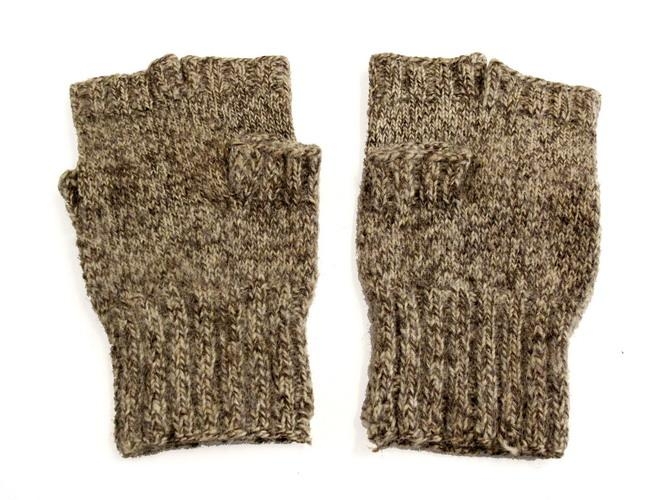 úr tvíbandi hvítu og mórauðu. Með fjórum götum fyrir fingur. Lengd