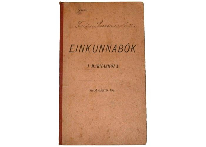 lista yfir námsgreinar og handskrifaðar einkunnir Fríðu með blýanti og