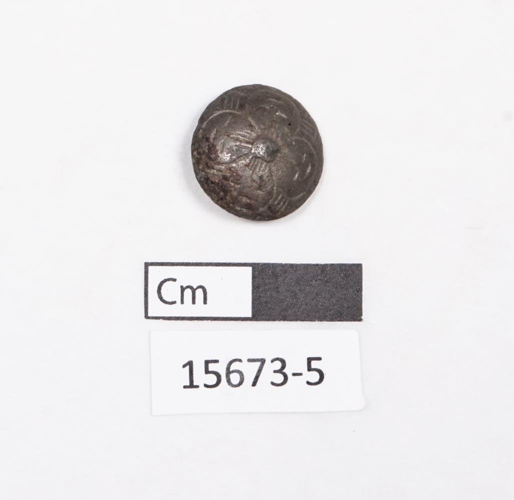 5. Hnappur, kringlóttur og kúptur, úr gráum málmblendingi, þvm. 1.3 og þ. liðl. hálfur sm. Á framhliðinni grafið skraut, afturhlið flöt og þar leifar af fæti. Greina má spanskgrænuhrúður.