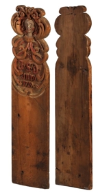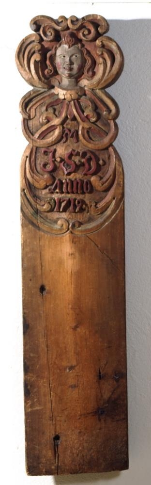 Stóls- eða sætis-brík úr sömu kirkju, skorin með manns eða engilshöfði að ofan og rósum þar út frá, í renaissance-stíl, og fángamarki M.J.S.D., fángamark Jórunnar Steinsdóttur biskups anno 1719. Hún giptist fyrst Hannesi Scheving á Múnkaþverá 1717, en síðan Stefáni Einarssyni, er fyrst var prestur þar á sama stað, og síðan að Laufási 1739.