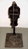 á trépalli sem er 42 x 46 cm. Hann er líkt og stór svartur hjálmur sem