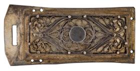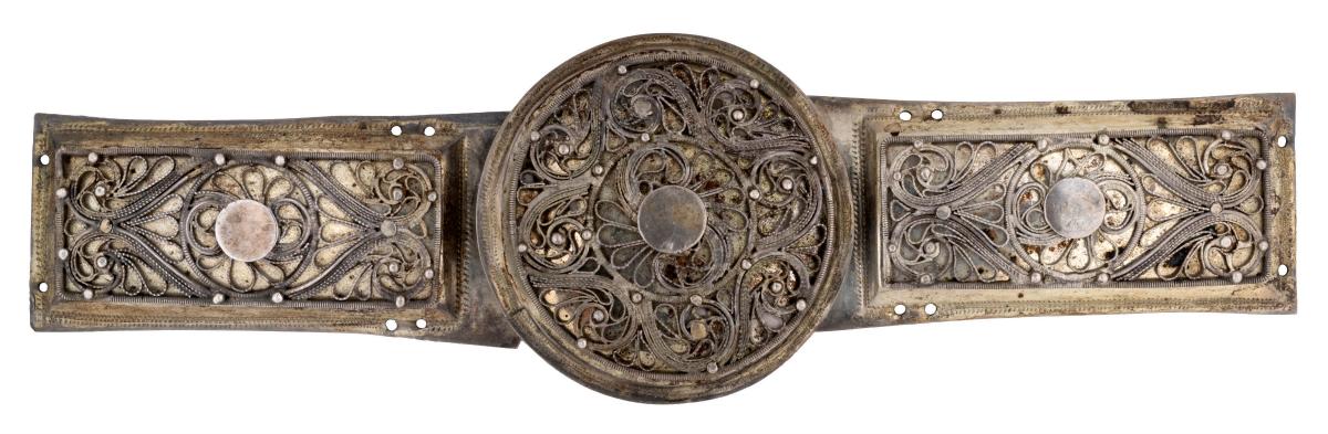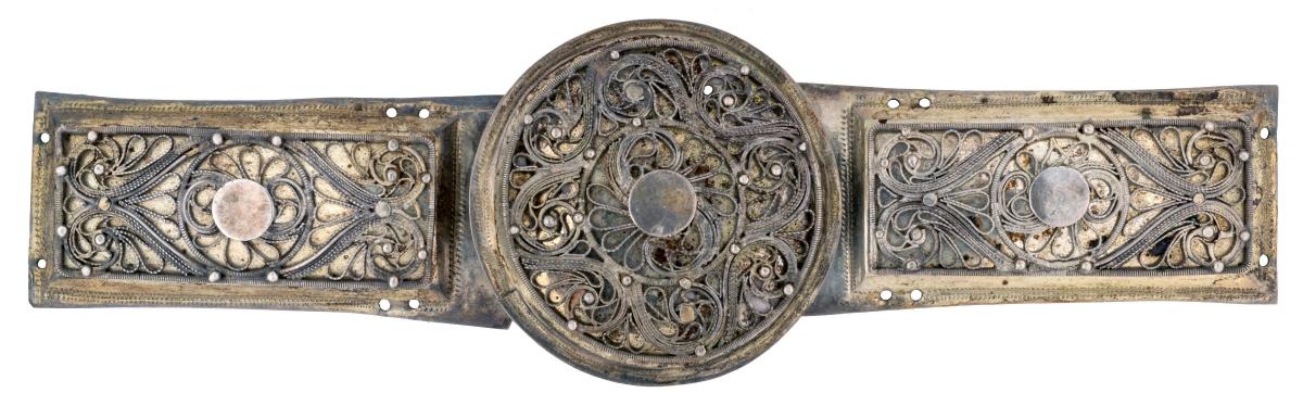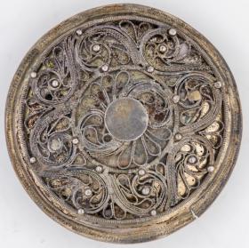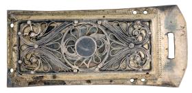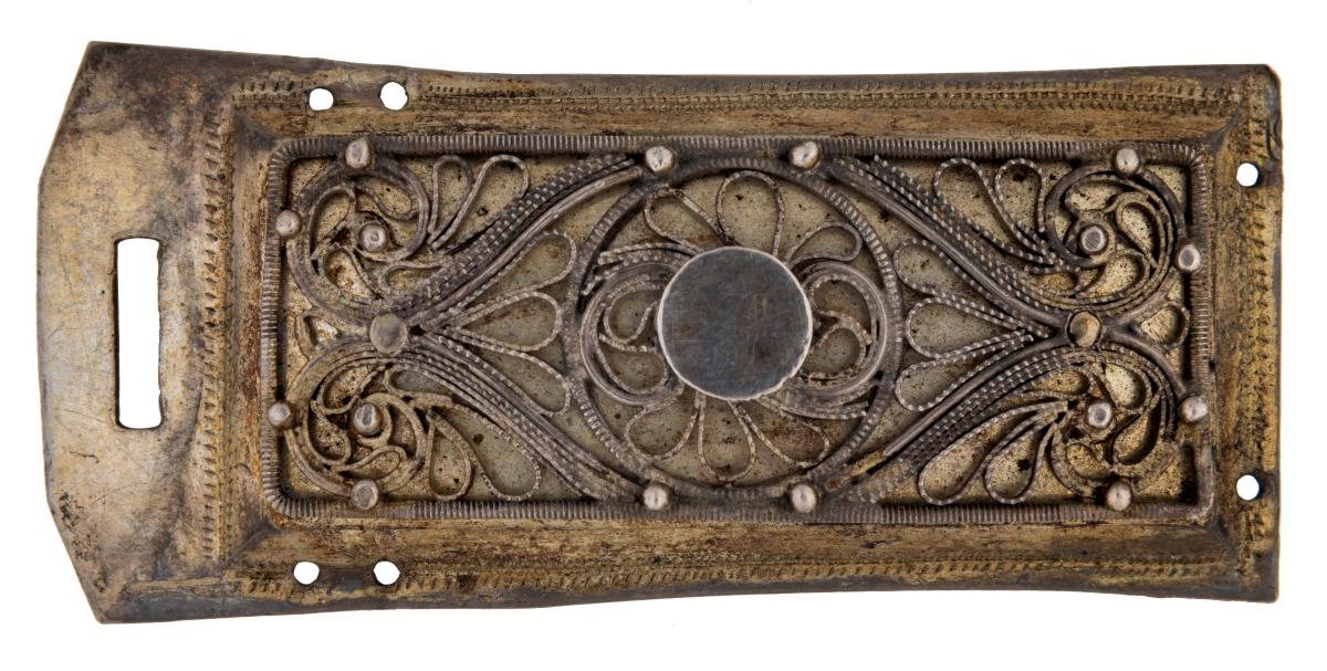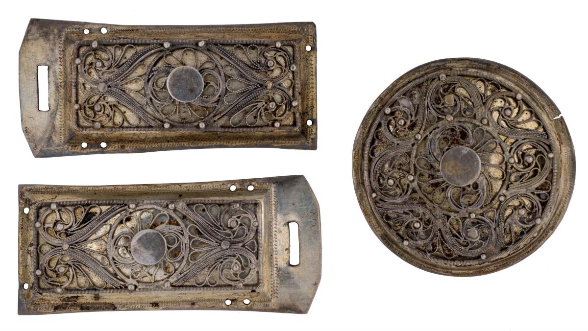 Skjöldur, Þvm.4,4 cm, og 2 stokkar, L.6 x Br.3,8 cm, með víravirkisskreytingu. Þyngd 45 gr.