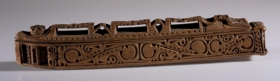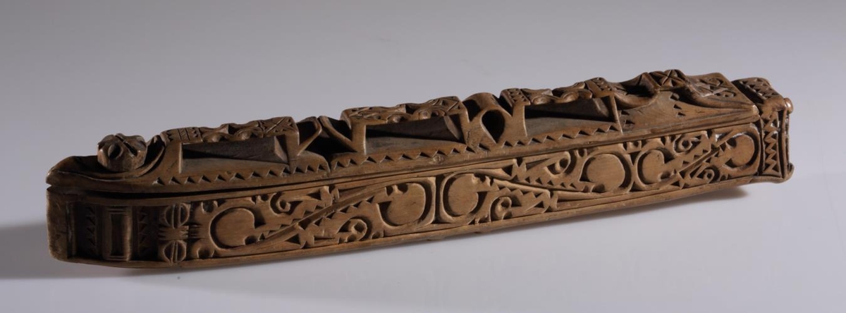 Prjónastokkur, 30 sm. á lengd: hann er dreginn að sér í annan endan og er eigi ósvipaður skipi í laginu: á hliðunum er einkennilegur skurður, hnútar og leggir og laufaskurður. Lokið leikur á nagla ofan í trjónunni og er bustmyndað og gagnskorið með snotrum skurði. Allur er stokkur þessi haglega gerður.