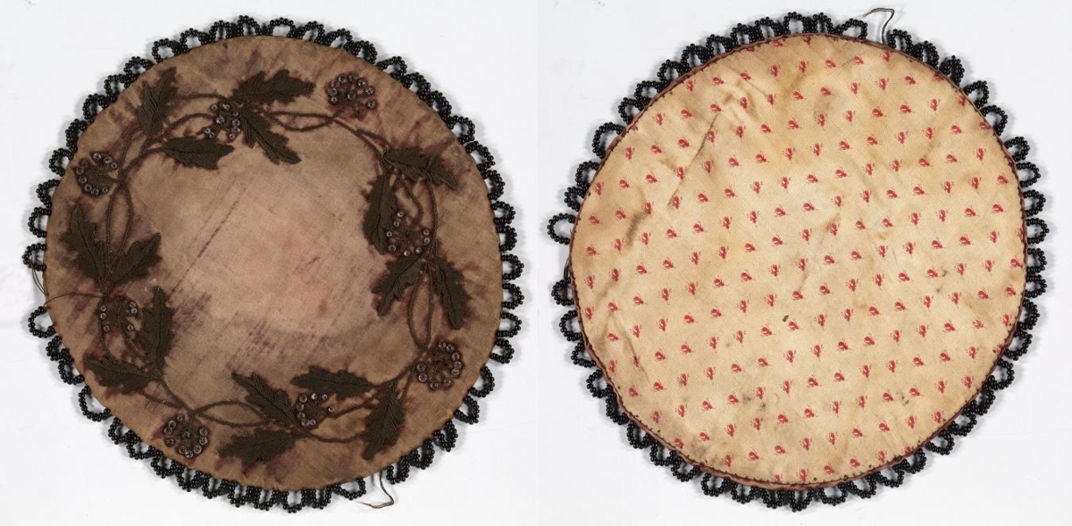 Dúkur, lítill, útsaumaður, úr þunnu silki, neðra borðið úr rauðdröfnóttu lérefti: í hann eru saumuð sóleyjarblöð með listsaum, en blómin eru saumuð með silki og smáum glærum glerperlum: utan á jaðarinn allt í kring er festur krans úr svörtum perlum: dúkurinn er kringlóttur, 14,7 cm að þverm., hefur sennilega verið bleikrauður í fyrstu, en silki, sem í hann er saumað, hefur látið lit, svo nú er hann allur blettóttur og að mestu brúnleitur: ísaumurinn er nú dökkbrúnn. - Hann er gerður af ömmu (móðurömmu?) Einars Thorlacius, sýslumanns á Seyðisfirði.
