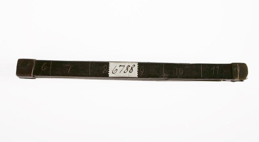 Kvarðinn er 1,3 cm. að br., skaptið 1 cm. að þykt, með látúns- og eir-þynnum