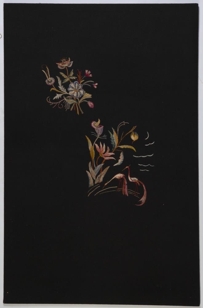 Útsaumuð mynd með blómum og fuglum. Saumuð í svart ullarefni, af Fjólu Stefáns Fjeldsted, f.k. Daníels Fjeldsteds læknis, eftir teikningu Guðmundar Thorsteinssonar (Muggs) árið 1923. Hann hafði hugsað sér fleiri myndir á teppið en entist ekki aldur til að teikna þær á. Kom ásamt 1970-110.