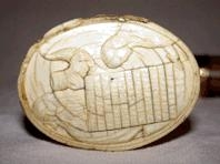 járnnöglum. Lágt upphleypt mynd gerð á handfangsenda, og eru hér skorin