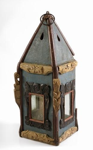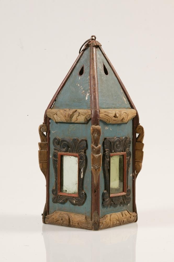 hlið er annars ferhyrnd rúða og útskurður um. Ljósberinn er allur málaður,