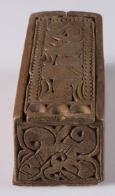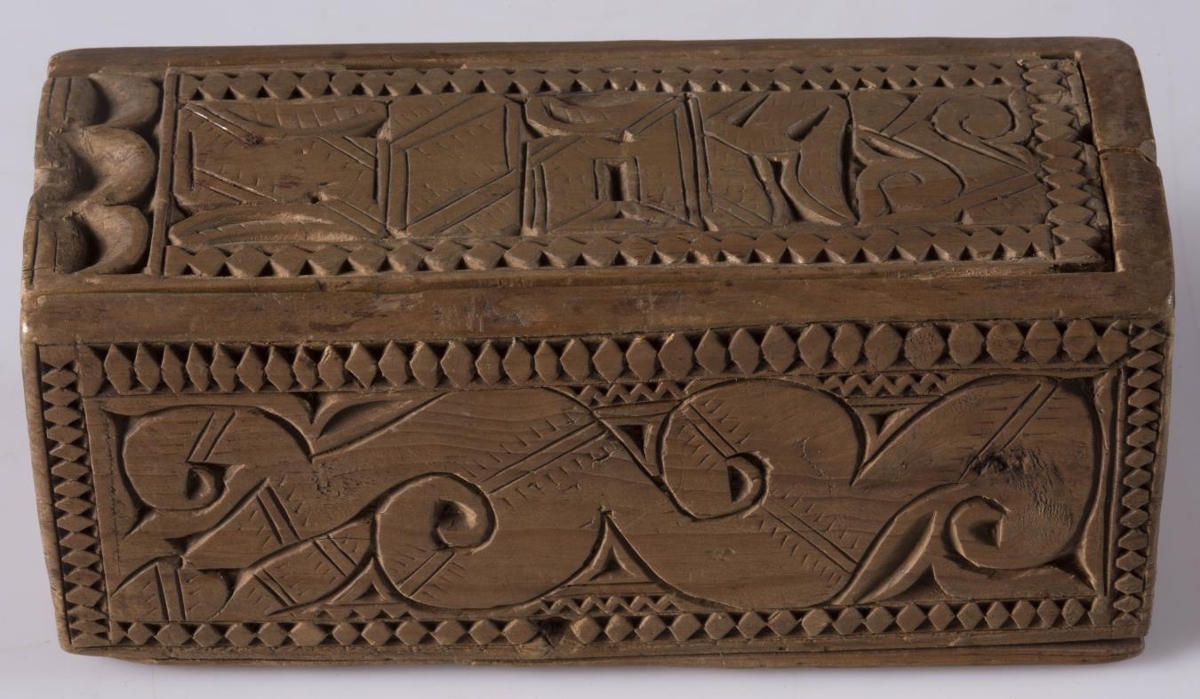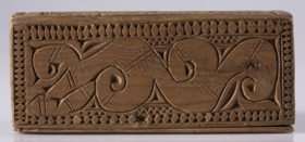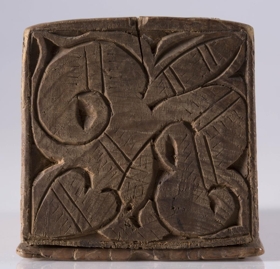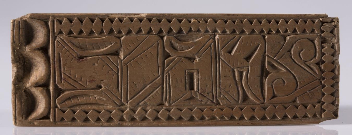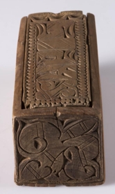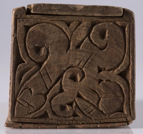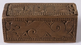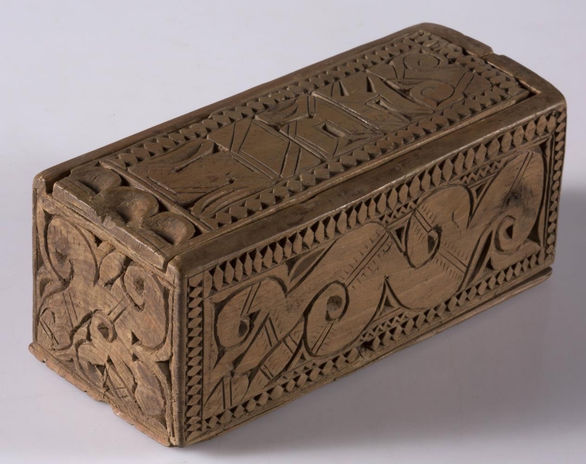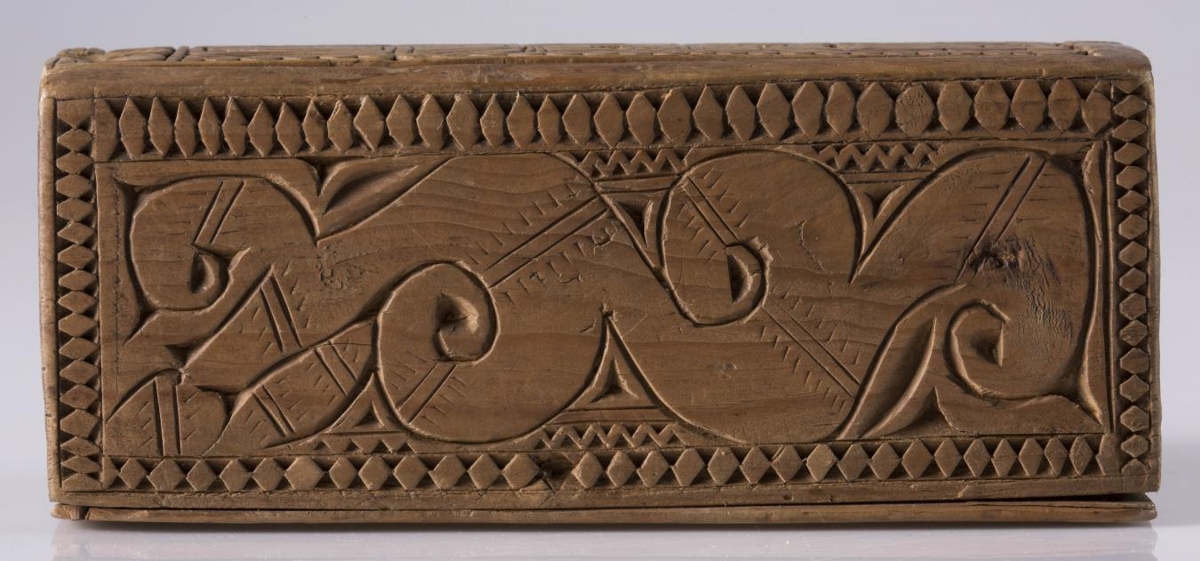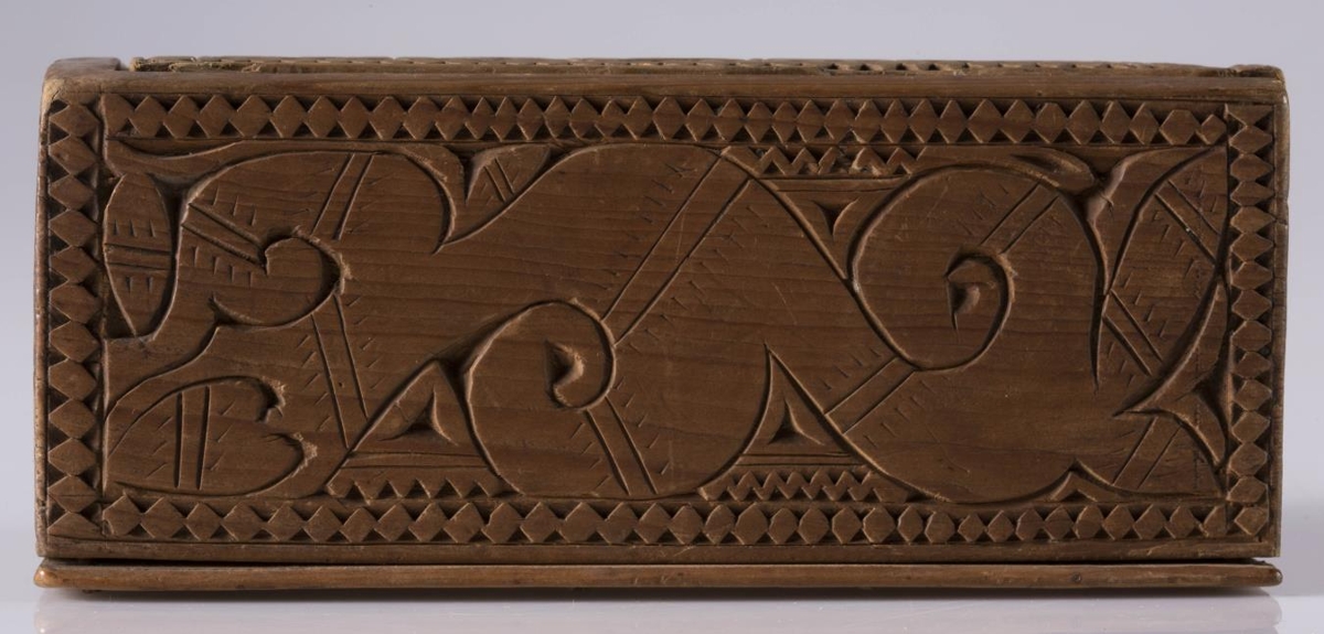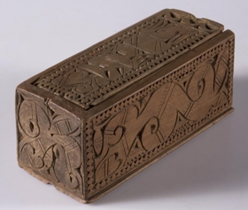 Lítill stokkur með dragloki og leggjarósum á hliðum og göflum og laufaskurði utan með á hliðunum: Á lokinu stendur með höfðaletri: S J D A S (s: S.J.D. á stokkinn) og laufaskurður utan með.