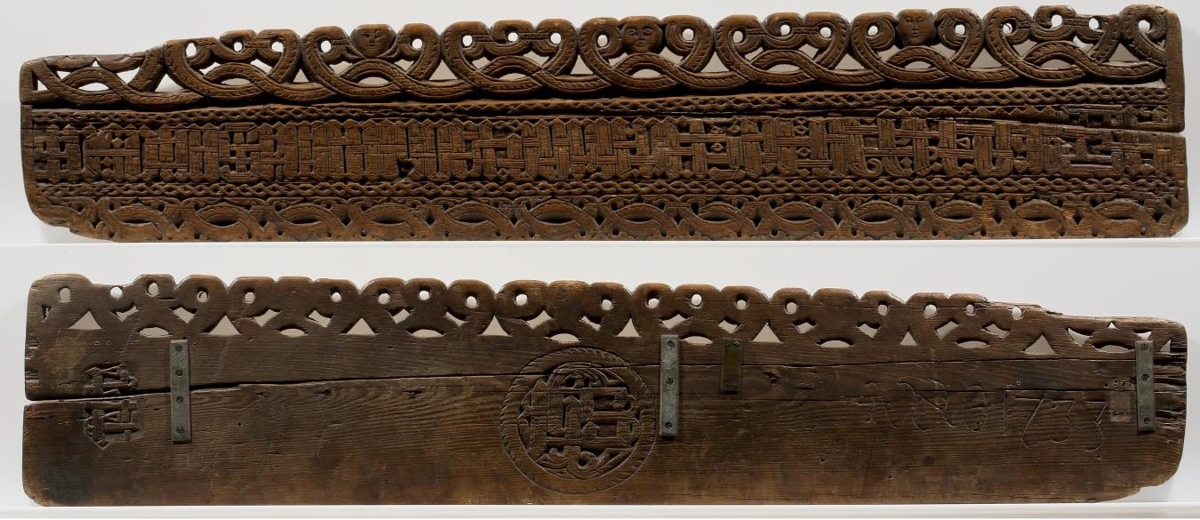 Rúmfjöl úr furu, l. 103 cm., br. 19,5-21,5 cm., þ. 1,5-1,7 cm. Efsti partur er gagnskorinn, með greinum og engla (?) höfðum, miðparturinn er með leturlínu* og eru snúrur beggja vegna, en neðsti partur er með bogum er lút hver móti öðrum og eru lauf á endunum. Aptaná er hringur með ihs á miðju, en EIS samandregin við annan enda og ANO 1733 við hinn.