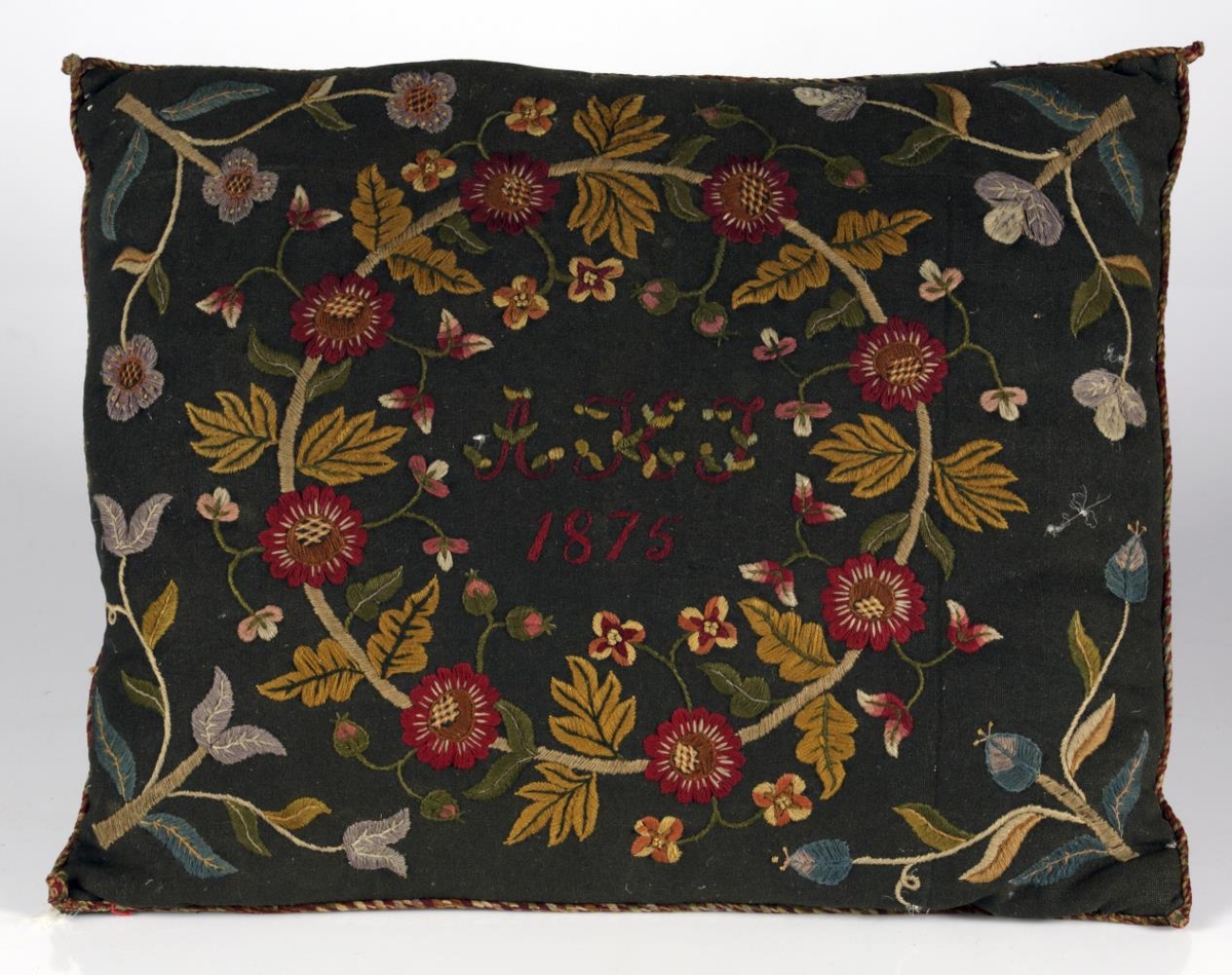 Söðulsessa troðin með fiðri, 46 x 37 cm að stærð. Sessuverið er úr einskeftudúk úr svörtu ullarbandi, en á jaðrana allt í kring er saumuð snúra úr gulu, rauðu og mosagrænu bandi. Sú hliðin, sem upp snýr, er öll skatteruð. Aðal munstrið er stór blómsturhringur með 8 stórum, rauðum blómum auk smærri blóma og blómknappa og gulum og grænum blöðum. Í hornunum er fyllt upp með mismunandi blómgreinum. Útsaumur þessi er allur með margvíslega litu ullarbandi. Innan í blómsturhringnum eru saumaðir stafir A K J sem eru upphafsstafir Önnu Kristínar Jónsdóttur, konu Jóhanns snikkara í Reykjavík, og neðan við er ártalið 1875.