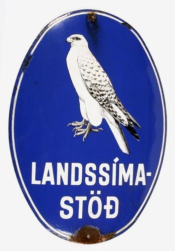 og á því er mynd af fálka og þar undir stendur með hvítum stöfum, LANDSSÍMASTÖÐ.