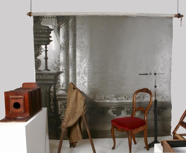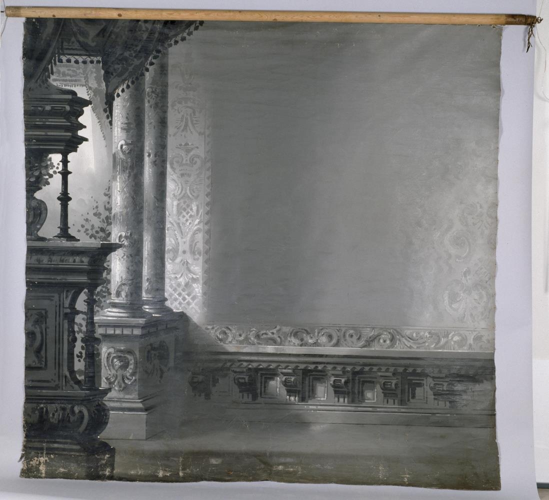 Baktjald sem tilheyrði ljósmyndabúnaði Nicoline Weywadt á Teigarhorni. Hansína Björnsdóttir kom með þetta málaða baktjald með sér að Teigarhorni þegar hún kom frá námi í Kaupmannahöfn 1902. Það þótti þá mikil nýjung. Á því er reynt að líkja eftir glæsilegum húsakynnum. Á það er málað með gráu skreyttar súlur, á vegg eru málaðir listar en undir þeim á ámáluð skreytt timburklæðning eða brjóstpanell.