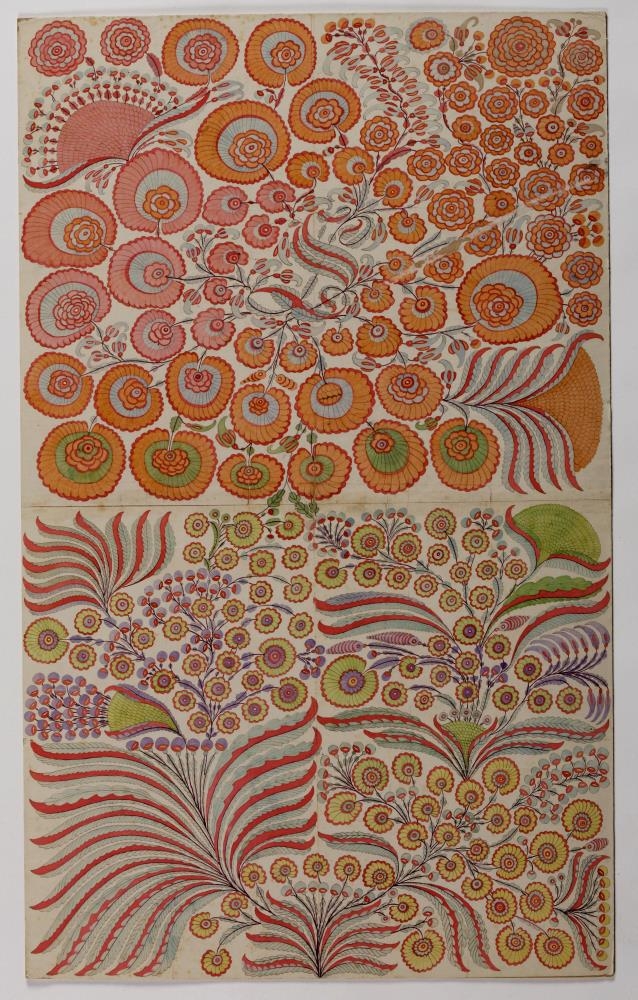 Teikning eftir Sölva Helgason, hinn þekkta umferðarmann ("flæking"), f. 1820, d. 1895. Myndin er í raun samsett af tveimur myndum sem þó tengjast lauslega á samskeytum í teikningu. Þær eru málaðar á tvær ljósar pappírsarkir en svo límdar saman á eitt pappaspjald, önnur ofan við hina og eru samskonar form í þeim báðum. Efri hlutinn sýnir upphafsstaf Sölva; S, í bláum og rauðum lit og allt um kring eru blóm í appelsínugulum, rauðum, grænum, bleikum og bláum litum. Neðri hlutinn sýnir blóm og blómfléttur í rauðum, grænum, bláum og fjólubláum litum. Litirnir eru líklega vatnslitir sem Sölvi hefur útbúið sjálfur. Myndin er í góðu ástandi og litirnir skærir og lítið upplitaðir. Sjá má að pappírinn hefur einhvern tíma verið brotinn saman en það er þó ekki mjög áberandi. Myndin hefur skaddast svolítið á efri hlutanum þar sem rifnað hefur úr pappírnum þegar myndin hefur núist utan í eitthvað og dregist til. Annars er myndin í góðu ástandi.