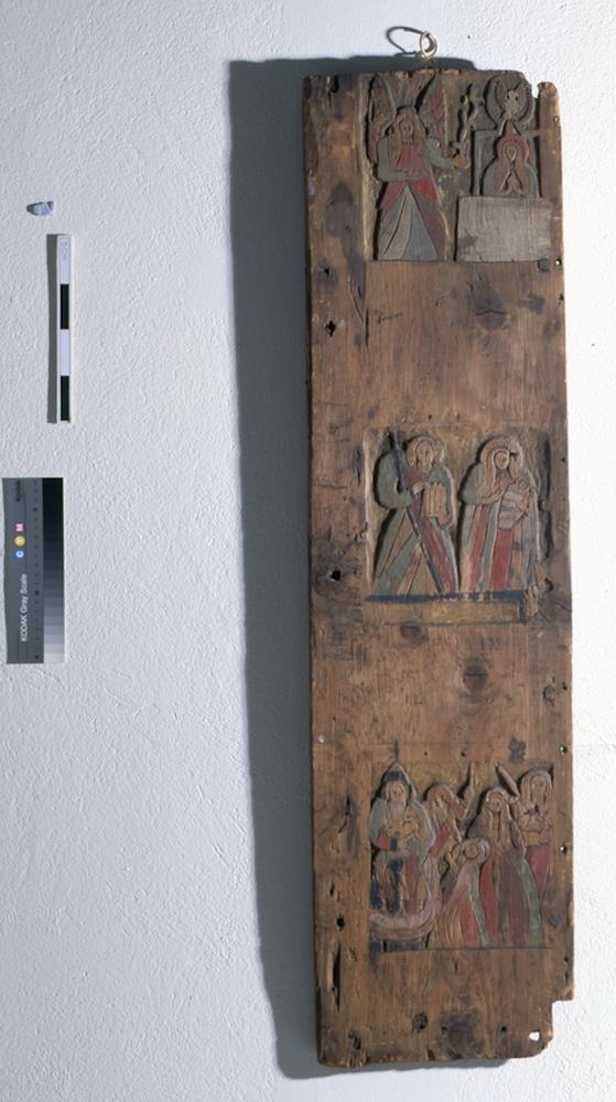 Sljettur, 11,8 cm. br. bekkur hefur verið skráð áletrun, sem nú er horfin, milli þessara mynda og hinnar neðstu. Litirnir eru einnig máðir af þessum hluta fjalarinnar. Að aptan er hún auð. Þá er önnur fjöl, svipuð þessari, 107 cm að l. nú, 28,6 að br.og 2,5 að þ. Hún er einnig auð annars vegar, á bakhlið, en með 3 útskornum myndum og litskreyttum á framhlið: þær eru um 20 - 22 cm. á hvorn veg og eru breiðir sljettir kaflar fyrir neðan, sinn fyrir hverja mynd, sem hafa verið skrifaðar á skýringar eða tilvitnanir, en eru nú af. Efst er boðun Maríu, í miðju fæðing Jesu, Jósef og María standa saman, hún heldur á barninu reifuðu, en jata og 2 nautgripir eru fyrir framan þau, neðst. Á neðstu myndinni er umskurnin. Þessi fjöl gæti verið úr þeirri sömu töflu og hin, en aptur á móti er það ekki líklegt að þriðja fjölin, er nú skal lýst sje úr henni, því að á henni eru einmitt sömu tvær myndirnar sem eru á hinni fyrri: krossfestingarmynd efst, 36 cm. há, og grasgarðsmynd, 19,5 x 17 cm., og lítið eitt af mynd hægra megin, en meira af myndinni vinstra megin, hinni sömu og er á fyrri fjölinni, að því er virðist. Þessi fjöl, sem er 107,5 x 28,5 cm., er ef til vill úr annari töflu líkri þessari, sem ætla má að hinar fjalirnar sjeu úr. Á þessari fjöl er þó sams konar verk, útskurðurinn, en af málningu sjást mjög litlar leifar. Áletranir hafa verið miklar undir myndunum, skrautlega ritaðar og sjer þeirra meiri vott en á hinum fjölunum, en þó ekki svo, að neitt verði lesið. Undir neðri myndinni sýnist vera tilvitnun í Lúk. XXII, og greinar úr þeim kap., hin 43-4: að því er helzt verður ráðið, með því orðalagi sem á þeim er í þýðingu Guðbrands byskups t.d. Loks eru 2 fjalarenningar: annar er 105,5 að l. 8,5 að br. og 1,6 að þ. Hann hefur verið lárjettur í töflunni, eða í undirtöflu og er hann neðri eða neðsti hluti af breiðara spjaldi. Sjer á honum neðsta hlutann af 3 myndum, br. 17, 24,7 og 19 cm. og leifar af skrifuðum