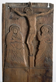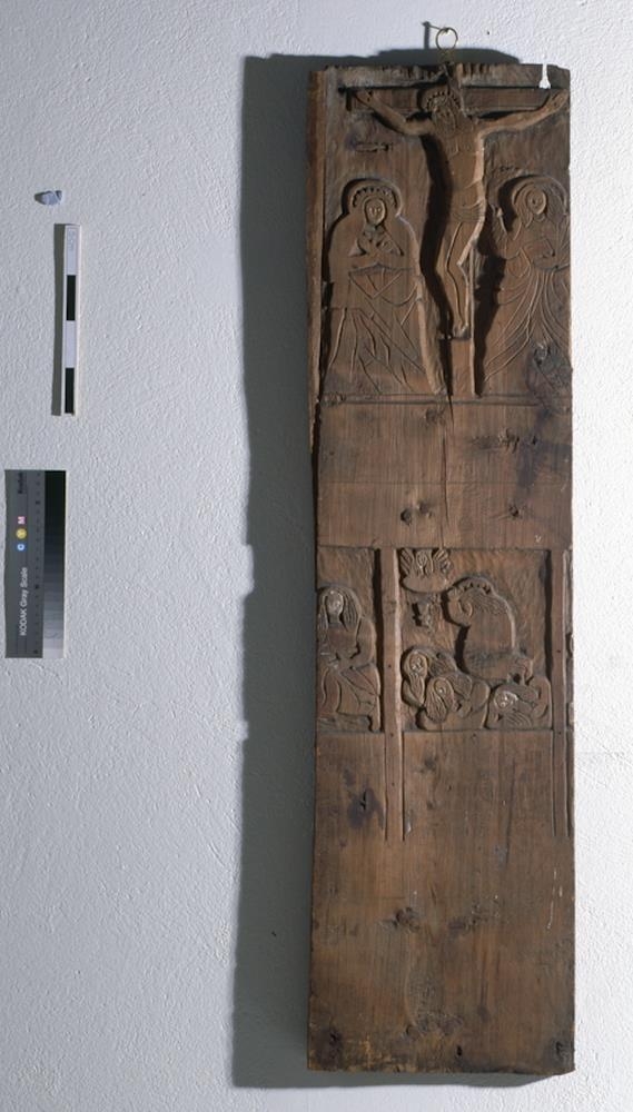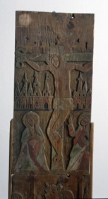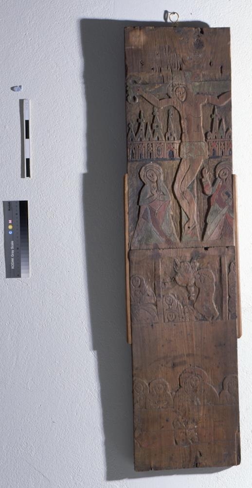 Fyrir neðan engilsmyndina eru 2 greinar. Allar eru þessar myndir með leifum af daufum litum, sem víða hafa máðst af, og grunnurinn er gulur. Er þetta sýnilega fráhverfan á þessari fjöl eða spjaldi: líklegt er að það sje önnur hurðin, hin hægri, af altaristöflunni, enda sjást för eptir 2 járnlamir. Má þá af þessari hurð gizka á stærð töflunnar: en eitthvað lítið vantar ofanaf því og allmikið neðanaf. Oki hefur verið um það þvert, fyrir neðan efri myndina. Þar næst er 1 fjöl, sem raunar hefur verið söguð sundur í miðju þversum og bútarnir notaðir í kistilsgaflana. Nú er þeim fest saman rjett. Hún er 114,7 cm. að l., 28,5 að br. og 2,8 að þ. Á efri hlutanum er sýnd krossfestingin, útskorin og litum skreytt lágmynd, flöt þó og sljett. Virðist hafa verið aðalmyndin á töflunni. En á neðri hlutanum ( og sömuleiðis á hinum fjölunum ) eru smærri myndir. Þessi er 44 cm. að h. og hefur líklega verið leturlína fyrir neðan, en er nú afmáð. Neðst er kvöldmáltíðarmynd, en fyrir ofan hana, og neðan krossfestingarmyndina, er grasgarðsmyndin fyrir, bæn Jesú, með lærisveinunum kaleiknum og englinum eins og vanalega. Beggja vegna við hana sjást hlutar af öðrum smámyndum.