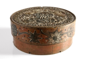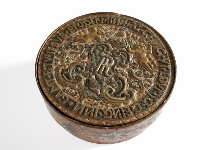 Trafaöskjur heldr litlar, lokið er alt útskorið með rósum, og þar í tveimur Englamyndum í heilu líki með vængjum, að neðan er fugl, og þar undir: "Anno 1677", á miðju lokinu er samandregið: "H.R." umhverfis á lokinu stendr með upphleyptu latinuletri: "eg geing ut edur inn, samt ertu iesus broder minn". Öskjurnar málaðar rauðleitar, og rósir á yfiröskjunni utan.