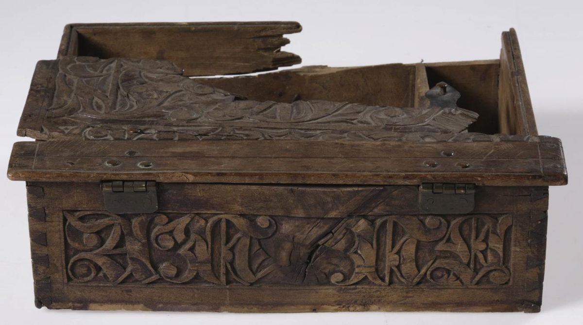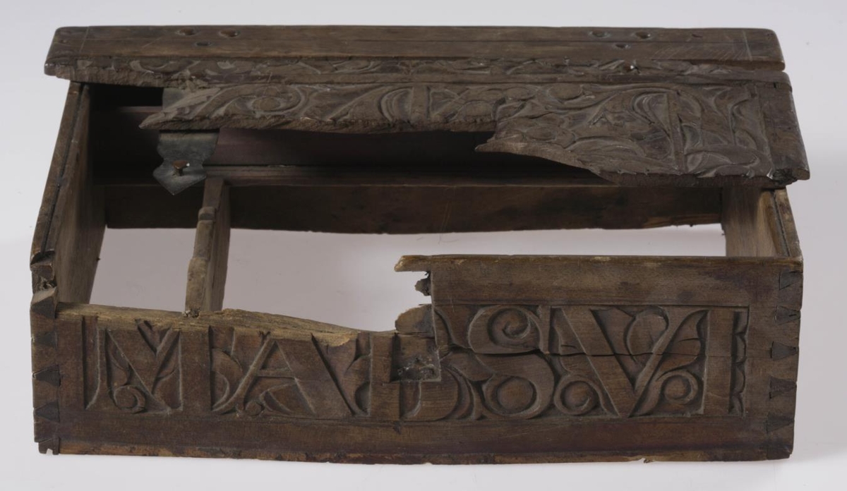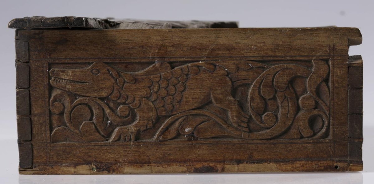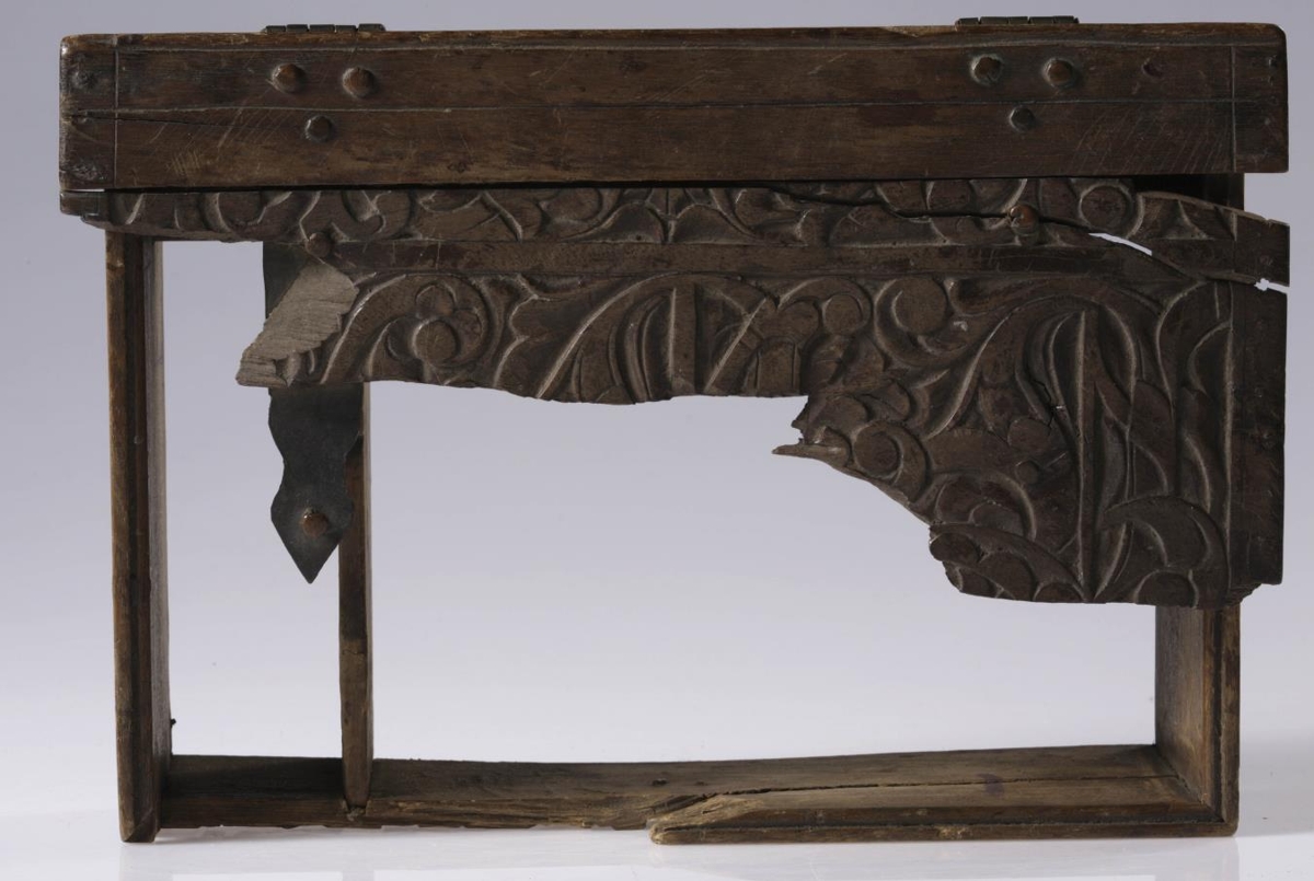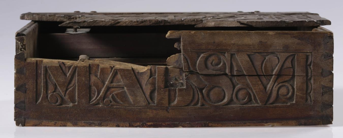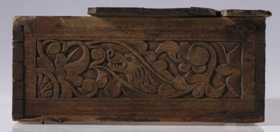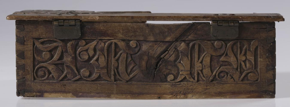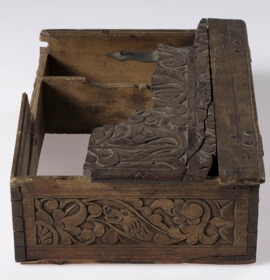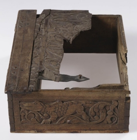 er brotið úr framhliðinni, þar sem ártalið er skorið. Á hliðum eru útskornar
