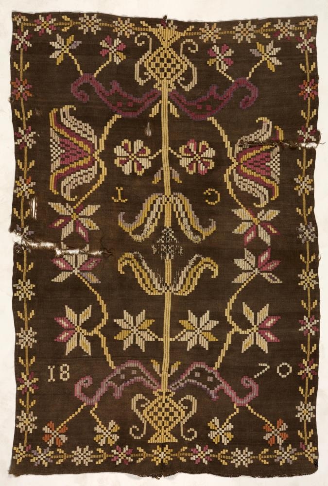Glitofið, nokkuð upplitað og slitið, með stöfunum G.T. og ártalið 1870. Grunnur brúnn, ofið í með gulu, hvítu og rauðleitu garni.