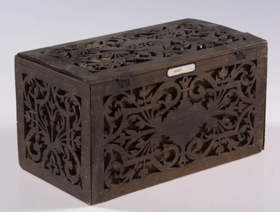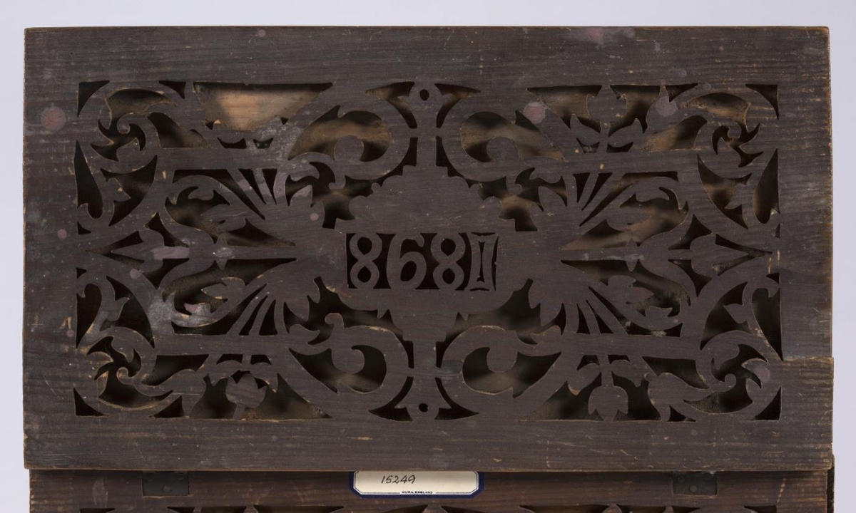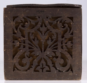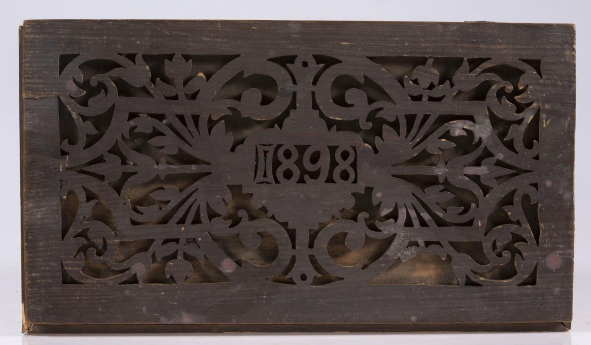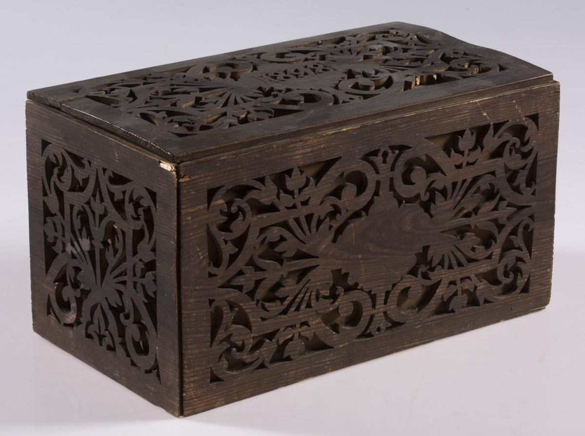 Kistill, lítill, með venjulegu lagi, hefur lok á hjörum. Smíðaður úr furu. Lengd 31 sm, hæð 16.5 sm, br. 17.5 sm. Til skrauts eru hafðar utan á hliðum og loki þunnar tréplötur, með gagnskornu verki, það sagað út. Plöturnar eru málaðar dökkbrúnar, lítið eitt rauðleitar, en kistillinn ómálaður undir. Skrautið er stílfært blómamunstur, samhverft alls staðar, og á lokinu er auk þess ártal: 1898. Innan á því er útskurður: rist blaðskraut og áletrun. Er áletrunin með höfðaletri, nema tvö tengiorð, hér skrifuð upp með venjulegri skrifstafagerð, eru þau með latínuletri á kistlinum: til FRÚ T.Þ.HÓLM frá S.J. Mun S.J. vera upphafsstafir í nafni Sigríðar Jónsdóttur frá Kinnarstöðum, sem smíðaði kistilinn. Skrá vantar, gegnskorna fjölin er dottin af vinstra gafli, en að öðru leyti er kistill þessi óskemmdur.
