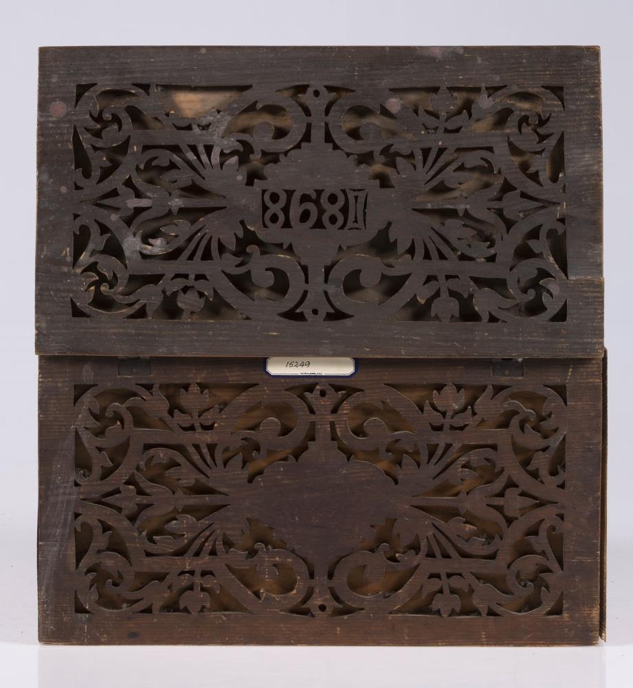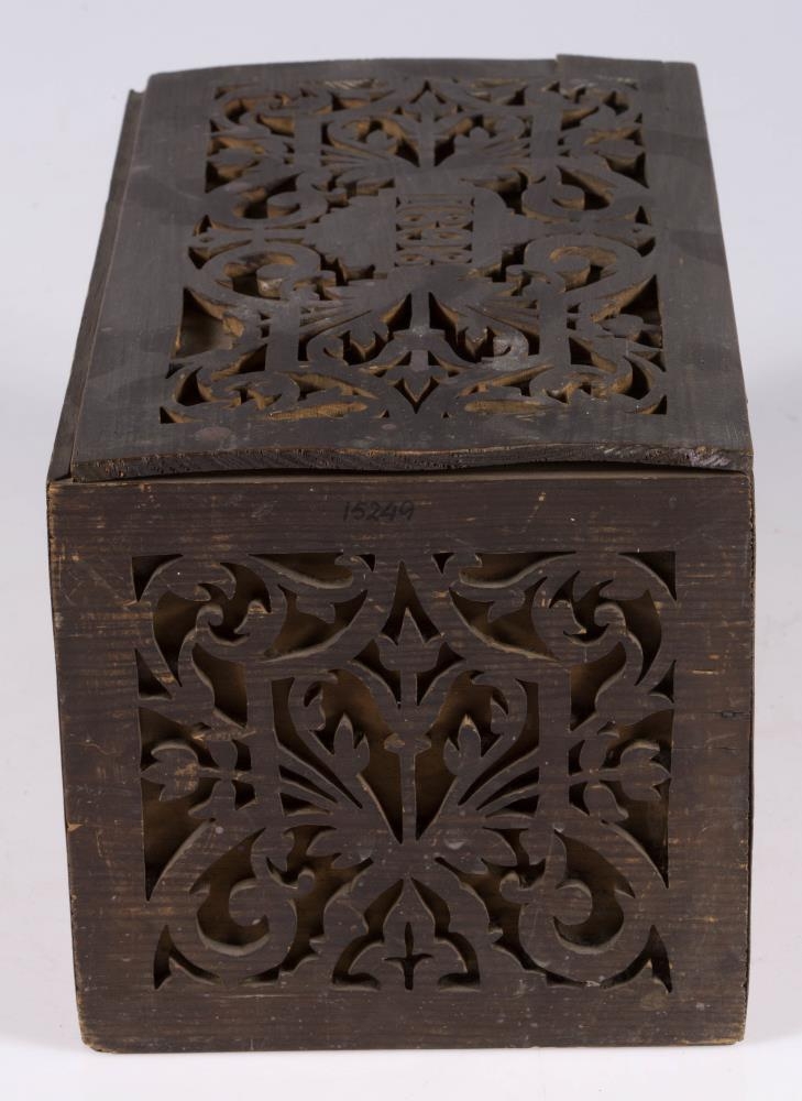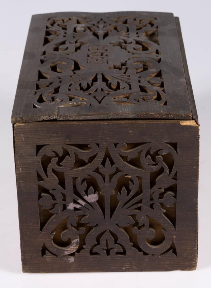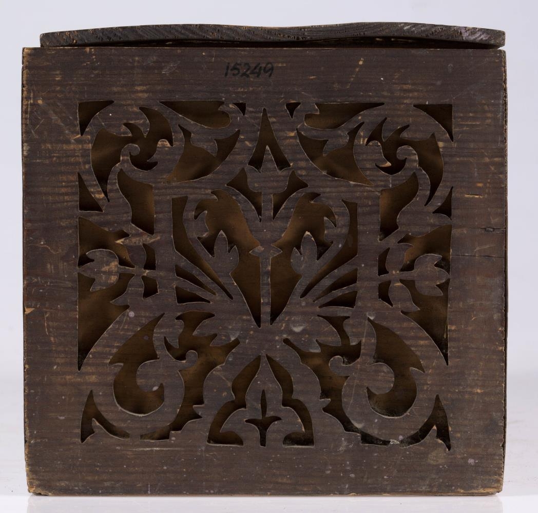 Kistill, lítill, með venjulegu lagi, hefur lok á hjörum. Smíðaður úr furu. Lengd 31 sm, hæð 16.5 sm, br. 17.5 sm. Til skrauts eru hafðar utan á hliðum og loki þunnar tréplötur, með gagnskornu verki, það sagað út. Plöturnar eru málaðar dökkbrúnar, lítið eitt rauðleitar, en kistillinn ómálaður undir. Skrautið er stílfært blómamunstur, samhverft alls staðar, og á lokinu er auk þess ártal: 1898. Innan á því er útskurður: rist blaðskraut og áletrun. Er áletrunin með höfðaletri, nema tvö tengiorð, hér skrifuð upp með venjulegri skrifstafagerð, eru þau með latínuletri á kistlinum: til FRÚ T.Þ.HÓLM frá S.J. Mun S.J. vera upphafsstafir í nafni Sigríðar Jónsdóttur frá Kinnarstöðum, sem smíðaði kistilinn. Skrá vantar, gegnskorna fjölin er dottin af vinstra gafli, en að öðru leyti er kistill þessi óskemmdur.