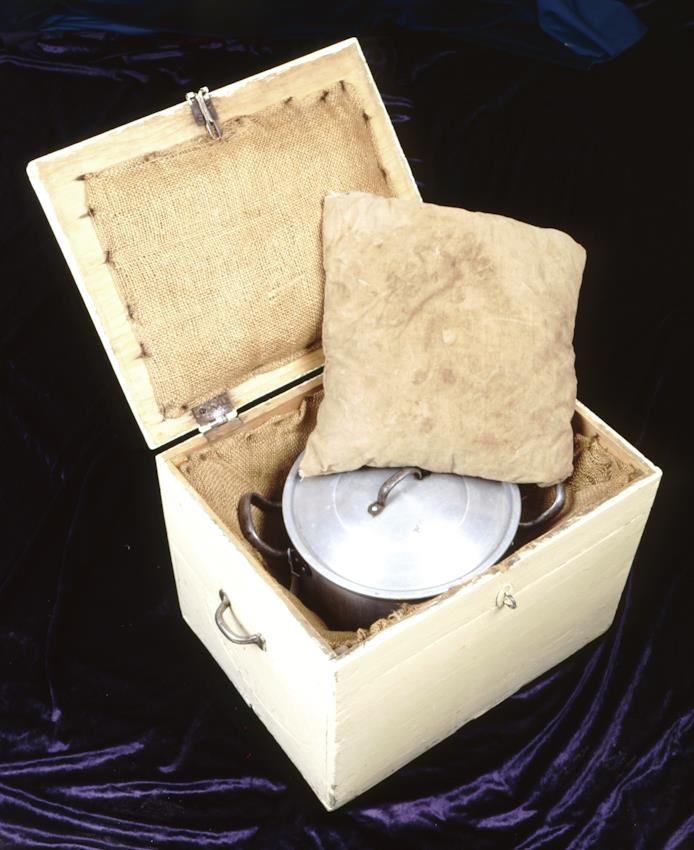 Gulmálaður moðsuðukassi úr tré með loki á hjörum. Hann er fóðraður að innan með striga og hálmstoppi bæði innan í kassanum og loki. Í kassanum er lítill koddi sem settur var ofan á pottana við moðsuðu. Á annarri hlið kassans er málmhandfang. Moðsuða er þegar suða er látin koma upp á mat og potturinn síðan settur í kassann þar sem suðan heldur áfram og maturinn fullsoðnar án þess að vera áfram á hellunni. Sjá grein eftir Hallgerði Gísladóttur í Gersemar og þarfaþing bls.262. Úr búi Önnu Klemensdóttur og Tryggva Þórhallssonar Laufási við Laufásveg ásamt fleiri munum sem hér koma á eftir í skránni.
