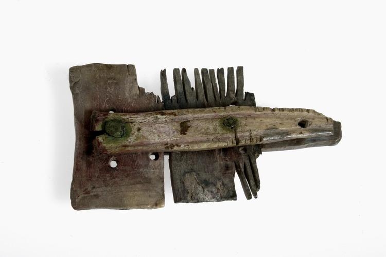 Beinkambur með hinu forna lagi, okar 2 með þynnum 2 á milli og standa eirnaglar 2 í gegn: okarnir eru 5,9 og 6,1 cm. að l. og 7-10 mm. að br. Br. kambsins er 3,5 cm. Þynnurnar eru báðar saman 4,5 cm. að lengd: er önnur endaþynna, nær ótent. Rákir 2 eru til prýðis eptir okunum langsetis. Virðist óslitinn og er vafasamt, hvort verið hafi nokkru sinni að gagni eða orðið fullgjör: er mjög óvandaður. Mun vera gamall, en alls ófúinn: líkur kömbum frá miðöldunum. Fanst í litlum helli norðan í Hvalfelli, sunnan við Hvalvatn: mun það vera Skinnhúfuhellir ( sbr. Árm.s, og Árb. 1881, 41). Eru bein mörg í hellinum og í hrúgu í brekku fyrir framan hann. Hefir hér að líkindum verið útilegumannabæli í fyrndinni.