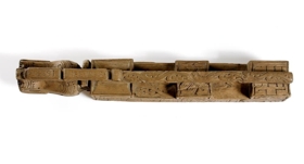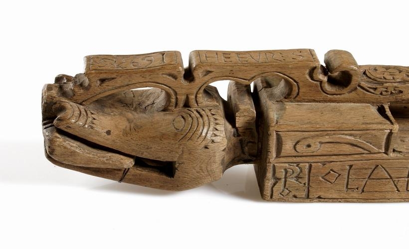 Trafakefli með gapanda drekahöfði á endanum, og hefir stóran bita í kjaptinum. Á það er ritað nafn með bandrúnum. Sömuleiðis stendur á því með latínuletri: OLAFVR SIGVS SON HEFVR S(korið) og enn fremur: I H S og 1693 P G S .
