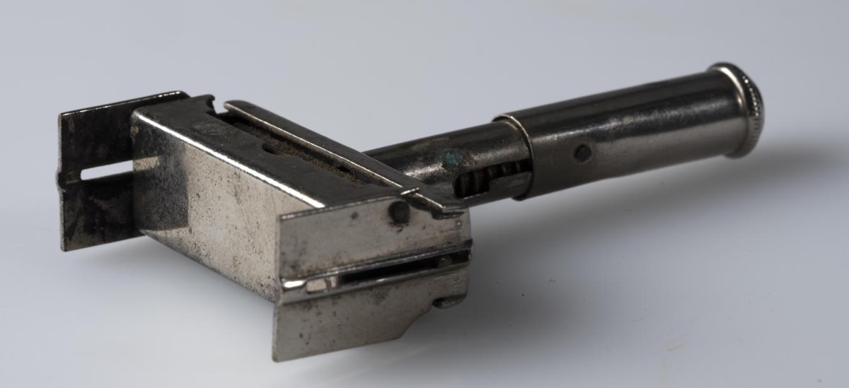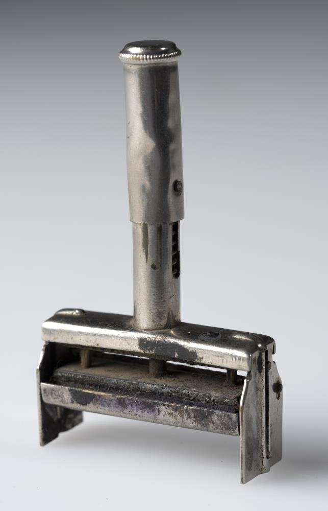 Stimpill Guðmundar Magnússonar (Jóns Trausta, 1873-1918), skálds og prentara, úr gúmmi, með skrifstöfum: Guðm. Magnússon, settur upp með umgjörð og handfangi úr nýsilfri.