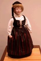Brúða í upphlut frá 20.öld. Búningur dæmigerður fyrir uphlut eins og hann er notaður í dag. Svartur upphlutsbolur með fjórum millum. Hvít upphlutsskyrta. Svart pils með svuntu. Skúfhólkur úr silfri. Brúður Sigríðar Kjaran. Sigríður gaf Þjóðminjasafninu brúðurnar sem hún hefur gert á liðnum árum. Þær sýna fólk við ýmis störf tengd íslensku þjóðlífi. Sigríður gaf brúðurnar með sérstöku gjafabréfi við opnun sýningar á brúðunum í Þjóðarbókhlöðu þann 3.febrúar 2001. Sýningin stóð frá 3.-25 febrúar. Sjá fylgigögn í fylgiskjalamöppu.