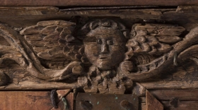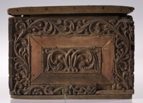 á göflunum er eikin skorin út með, blómi um 15 x 6,5 að st., en á framhliðinni