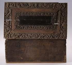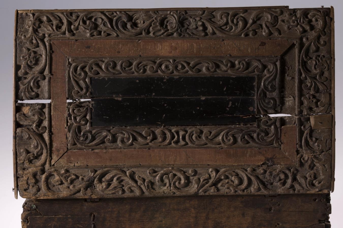 á miðju loki er svart-lakkeruð: líkkega austurlenzk, fjöl, eða 2 samsettar,