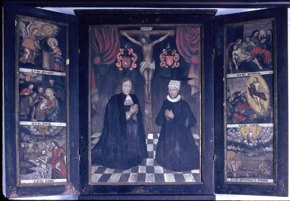 Innan á vængjum minningartöflunnar eru sex myndir, þrjár á hvorum. Á vinstri væng efst sést er Gabríel erkiengill birtist Maríu og boðar fæðingu Frelsarans. Situr María við lespúlt með hendur í bænarstellingum en engillinn heldur á pálmaviðargrein í vinstri hendi og blessar með hinni hægri. Bæði hafa þau gulan og rauðan geislabaug, en aftan við í skýjum flýgur dúfa, heilagur andi, einnig í geislabaug, en í honum er grænn hringur að auki við gula og rauða litinn. Neðan við stendur svörtum, gotneskum stöfum á hvítum grunni: Christi Getnaður. Á miðmyndinni sést tilbeiðsla austurvegsvitringanna, situr María með barnið í keltu sér, Jósef stendur á bak við hjá asna og uxa í gripahúsinu, en vitringarnir sýna Jesú lotningu og fellur einn þeirra fram. Í fjarska sjást svo fjárhirðarnir úti á völlunum og engill í geislabaugi hjá þeim. Undir myndinni stendur: Christi fæðing. Neðsta myndin er svo af skírn Jesú. Stendur hann í ánni Jórdan í lendaklæði einu fata, en Jóhannes skírari eys yfir hann vatninu. Yfir svífur heilagur andi í dúfulíki og á bak við er trjágóður og landslag en borgin Jerúsalem fjærst. Undir myndinni stendur Christi Skÿrn.