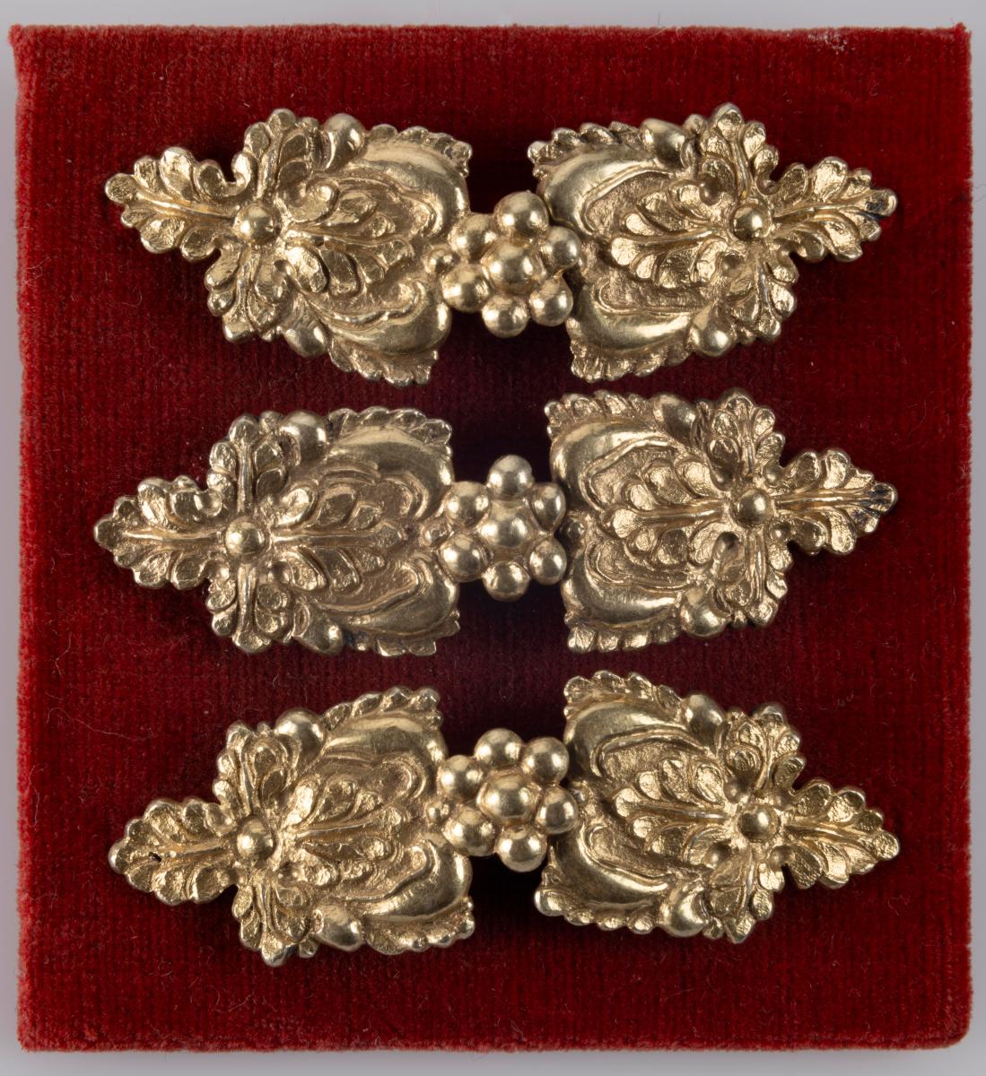 Höttpör þrenn úr silfri, gylt, steypt, með upphleyptu blómskrauti í skábogastíl og mjög