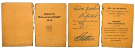 Félagsskírteini Alþýðusambands Íslands / Verkamannafélagsins Dagsbrúnar, útgefið 1947. Er eins og lítil bók, í rauðri, textílklæddri kápu með gylltum stöfum. Hún er í hulstri eða vasa úr samskonar efni.
