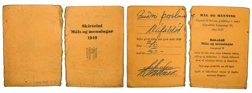 SKÍRTEINI MÁLS OG MENNINGAR 1949, prentað á gulan pappír. Orðið snjáð og sundur rifið.