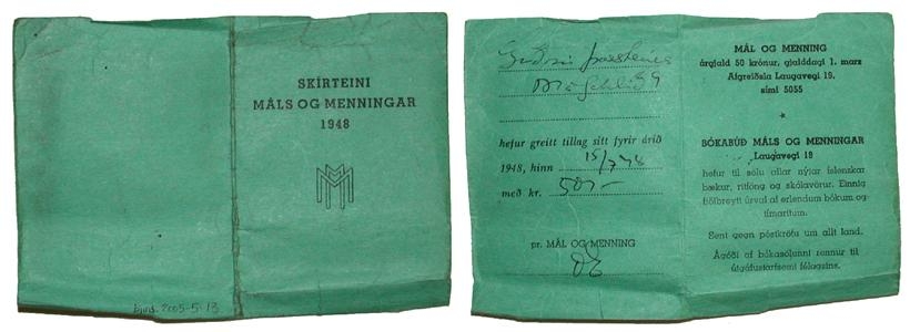 SKÍRTEINI MÁLS OG MENNINGAR 1948, prentað á bláan pappír. Orðið nokkuð snjáð.
