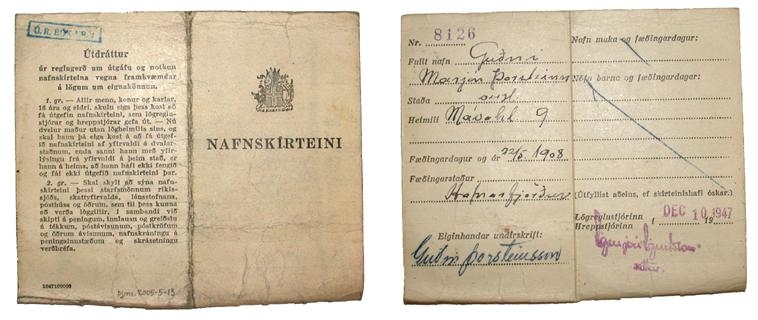 NAFNSKÍRTEINI Guðna, útgefið af lögreglustjóra 10. desember 1947. Prentað og skrifað á hvítan pappír.