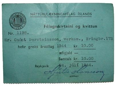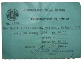 Félagsskírteini og kvittun NÁTTÚRULÆKNINGAFÉLAGS ÍSLANDS, útgefið 1944. Prentað á bláan pappír.