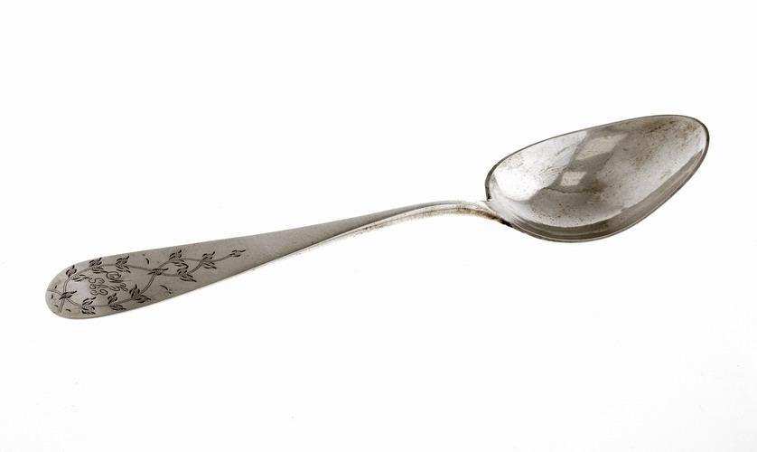 Matskeið úr silfri, ofan á skaftið er grafið blóma- eða laufsveigur og þar innan í stafirnir EJS/GMD, fangamörk séra Eggerts Jónssonar prests á Ballará í Dalasýslu og Guðrúnar Magnúsdóttur konu hans. Neðan á skafti er stimpill Rögnvaldar Sigmundssonar gullsmiðs í Innri-Fagradal á Skarðsströnd, d. 1871, sem smíðað hefur skeiðina, RS og einnig ártalsstimpill 18-38.