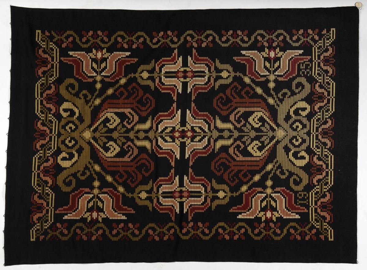 Veggklæði, góbelín, sem gef. vann 1935, og er það gert í stíl hinna íslenzku glitvefnaðarábreiða. Ártal á. Saumað er með ullarþræði marglitt jurtamunstur í dúk úr svörtum ullarjava, en að aftan fóður úr svörtum lastingi, bandið með jurtalitum. Gert ártalið 1935. L. 1 m 71 sm, br. 1 m 23 sm. Munstur samhverft um skil jafn langt frá endunum, er höfð blómjurt sitt hvorum megin og snúa báðar að miðju, en bekkur allt umhverfis. Við enda að neðan ártalið, þversum. Litir hvítgult, gult, gulbrúnt, bleikt, brúnt og rautt. Skreytið er stílfært mjög. Á enda að ofan seytján smáar lykkjur með jöfnu millibili og fest þar krossviðarfjöl, jafn langri og klæði er breitt, br. 6 sm og þ. 0.6 sm, horn sneidd af fjölinni og hún svartbæsuð. Klæði þetta fallegt, en sjá má á því litgalla.