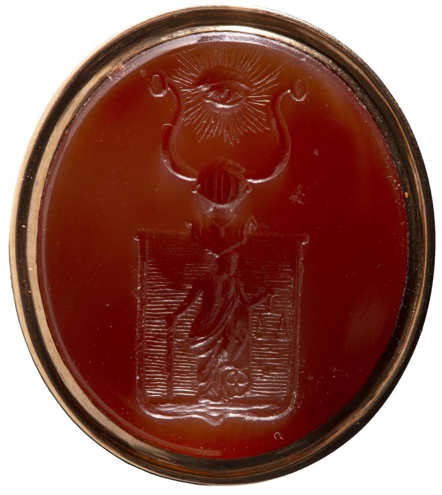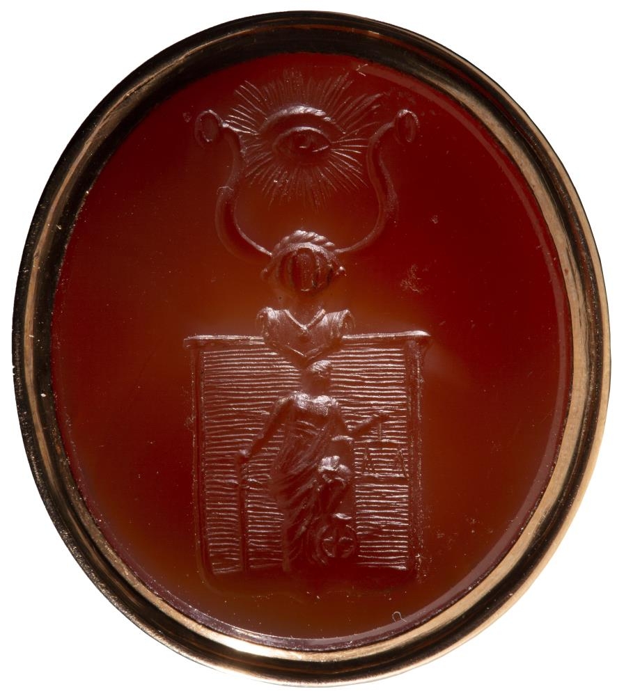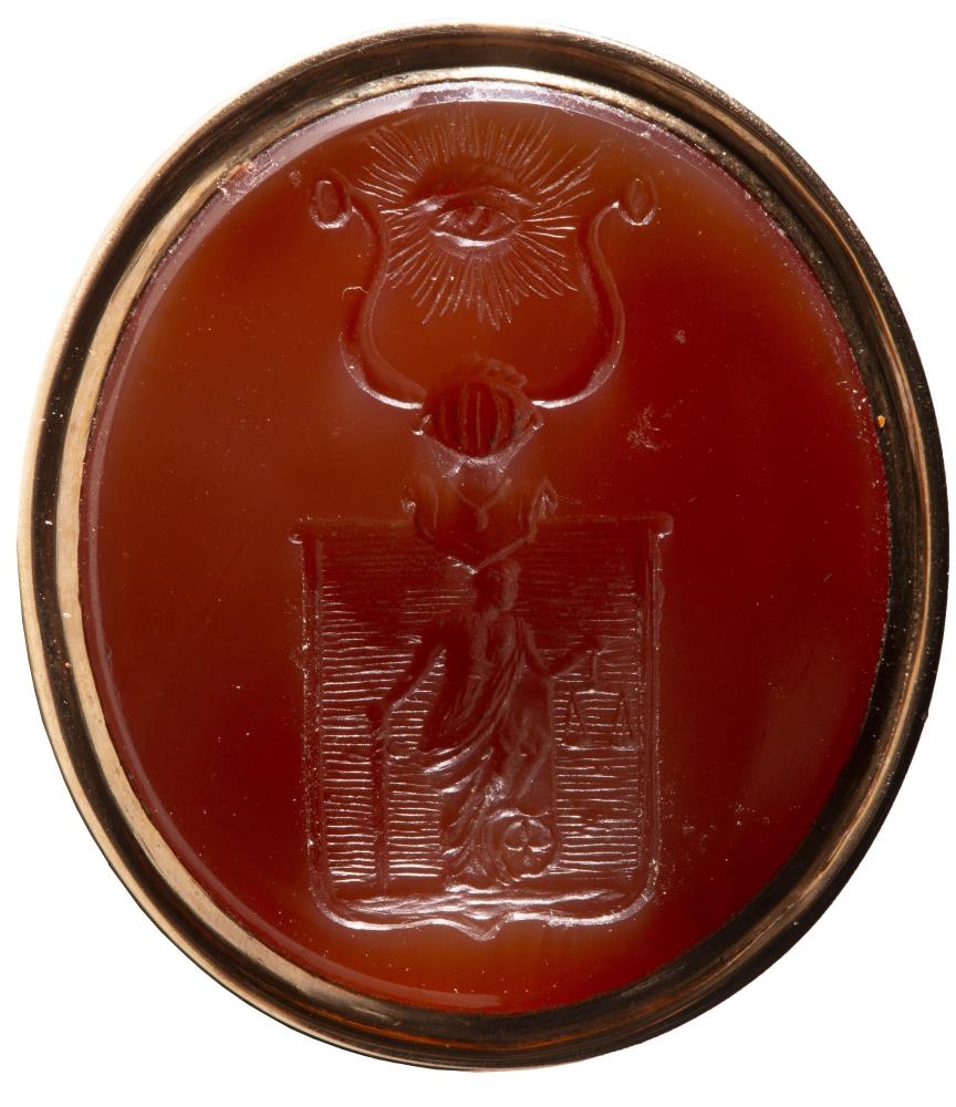 Innsigli Gríms amtmanns Jónssonar, föður gef., smíðað úr gulli og með rauðum steini sem grafið er í skjaldarmerki: á skildinum er Rjettvísi með sverð og metaskálir: á milli horna uppá hjálminum er auga með geislum útfrá, - tákn rjettlátrar dómspeki og glöggskygns eptirlits. Steinninn er neðaní eins konar kúpu með geislum á að ofan: þverm. 2,7 - 3 cm., h. 1,5. Ofaná kúpuna er fest beygja og þar ofaná hringur eða hólkur: er h. alls. 4, 2. - Sennilega hefur Grímur amtmaður látið grafa innsiglið þannig. Það mun ætlað til að hanga við úrfesti, til skrauts jafnframt.